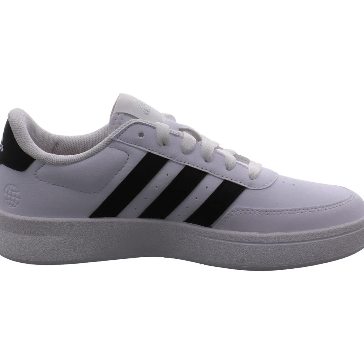 Das Obermaterial aus pflegeleichtem Kunstleder in klassischem Weiß, lässt sich gut kombinieren und wird durch die seitlichen drei Streifen und die Fersenkappe in Schwarz optisch noch aufgewertet.