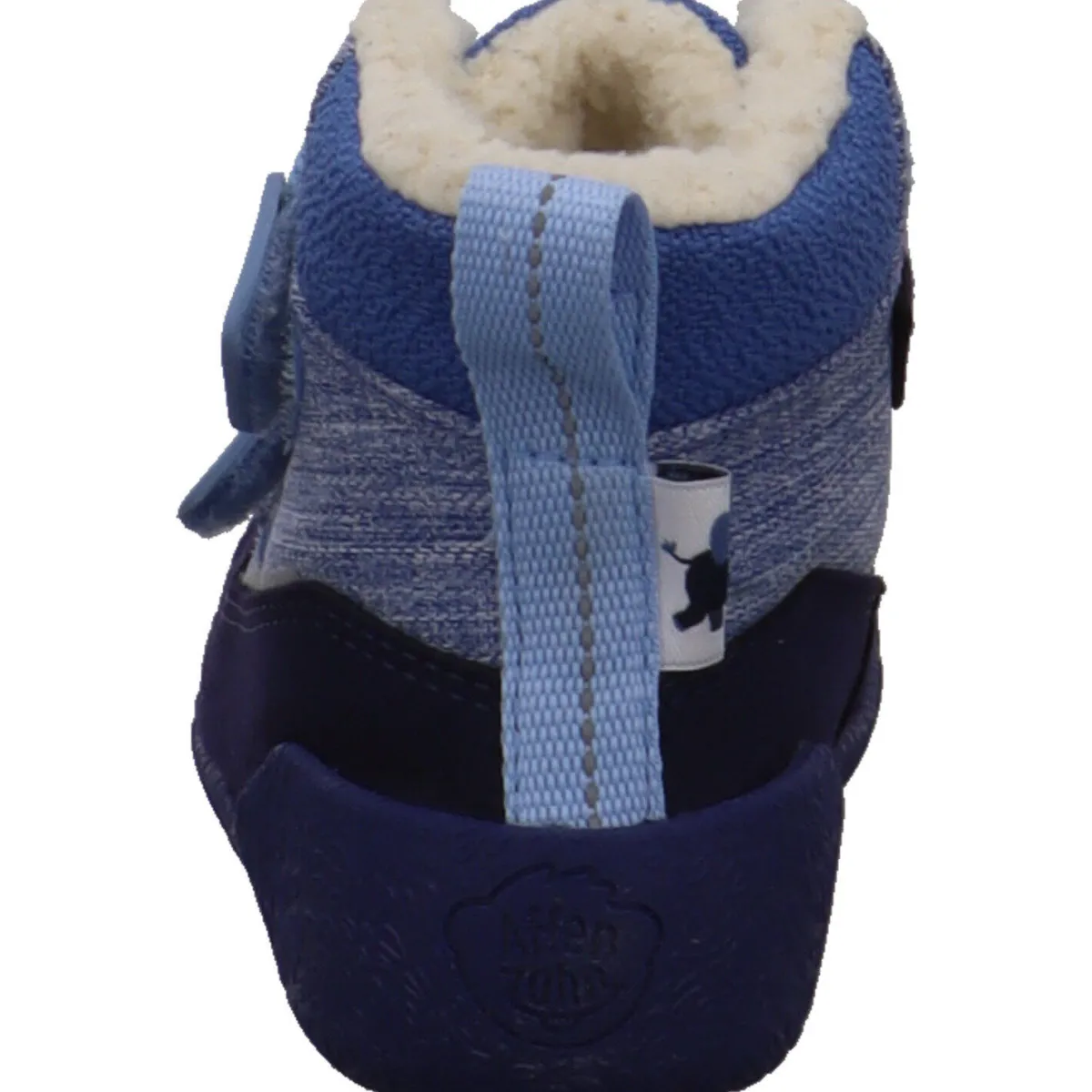 Er wurde aus recyceltem Polyester in Blau gefertigt. Durch den doppelten Klettverschluss auf dem der Elefant zu sehen ist, ist der Einstieg kinderleicht und der Stiefel kann genau an den Fuß angepasst werden.