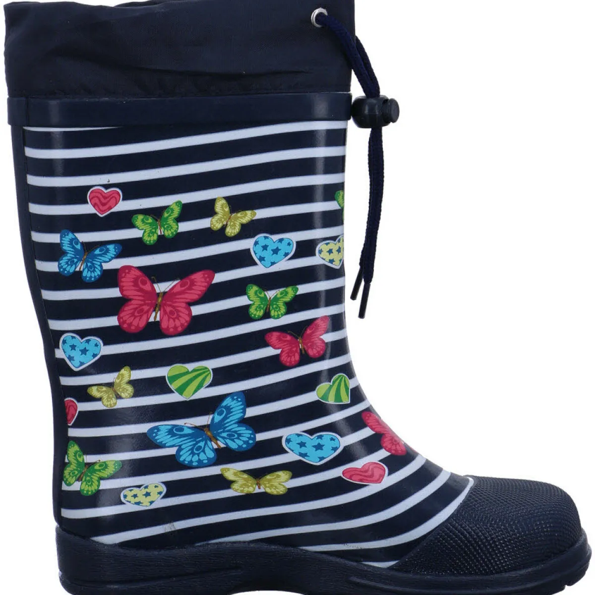 Der Stiefel fällt durch den farbenfrohen Druck mit Schmetterlingen und den Streifen Look sofort ins Auge und ist ein Highlight für jedes Mädchen.
