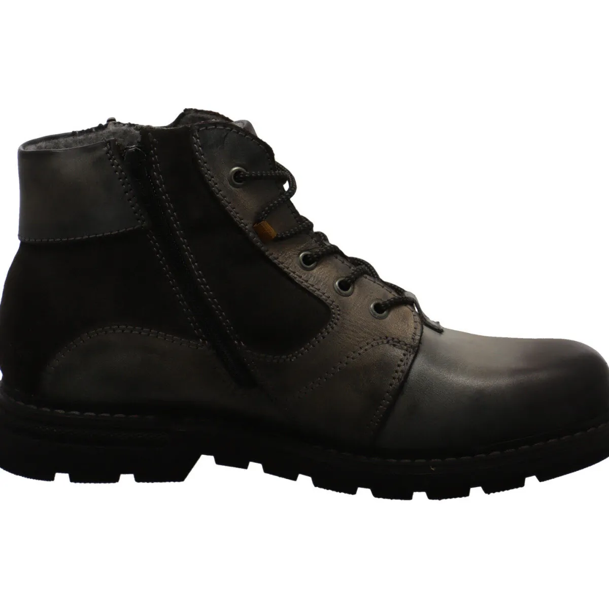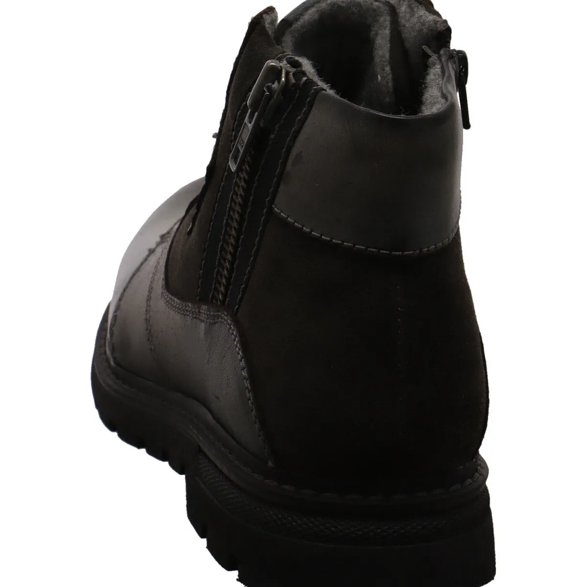 Das Obermaterial ist aus einem Mix hochwertigem Glattleder und Veloursleder in dunklem Grau gefertigt und mit einer authentischen Narbung versehen.