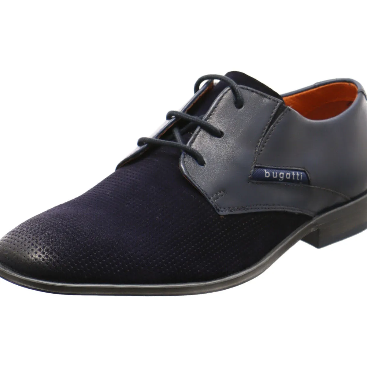 Das Obermaterial wurde aus einem Mix aus hochwertigem Glattleder und weichem, perforierten Veloursleder in dunklem Blau gefertigt und ist an der Seite mit einem textilen Einsatz mit der Bugatti Markenaufschrift versehen.