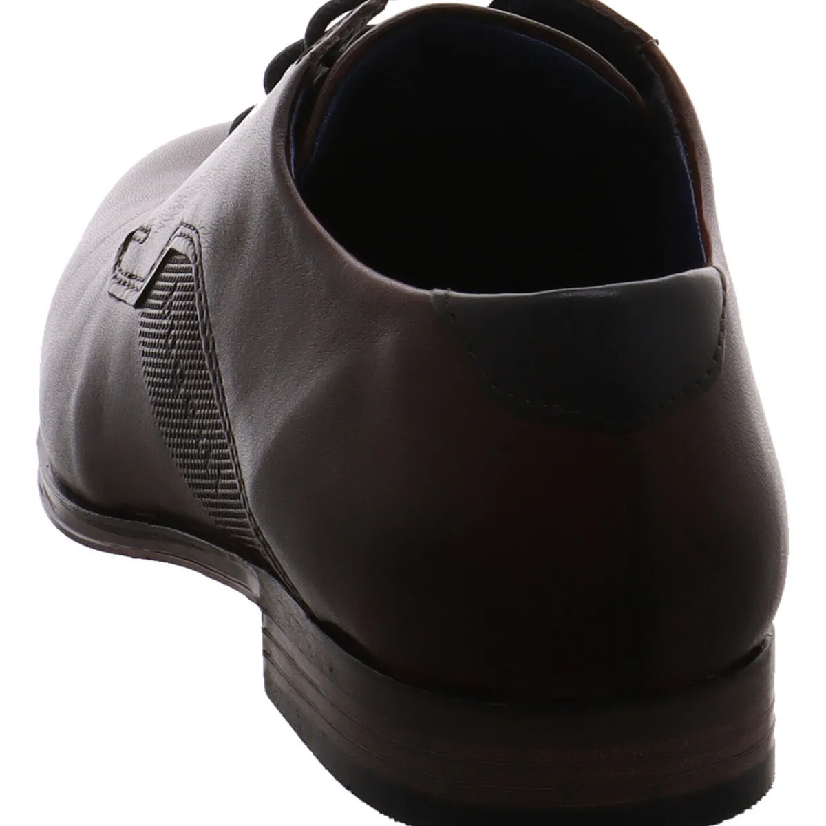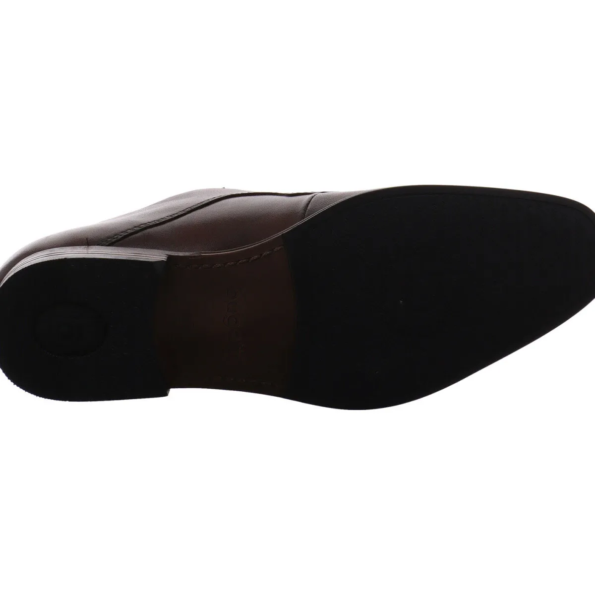 Das Obermaterial aus Glattleder in dunklem Braun ist an der Seite auf einer kleinen perforierten Oberfläche mit der Bugatti Aufschrift in Schwarz versehen. Dank der klassischen Drei-Loch Schnürung kann er optimal an den Fuß angepasst werden.