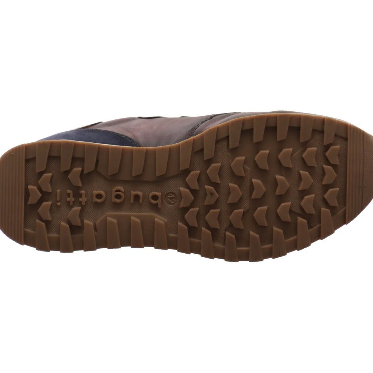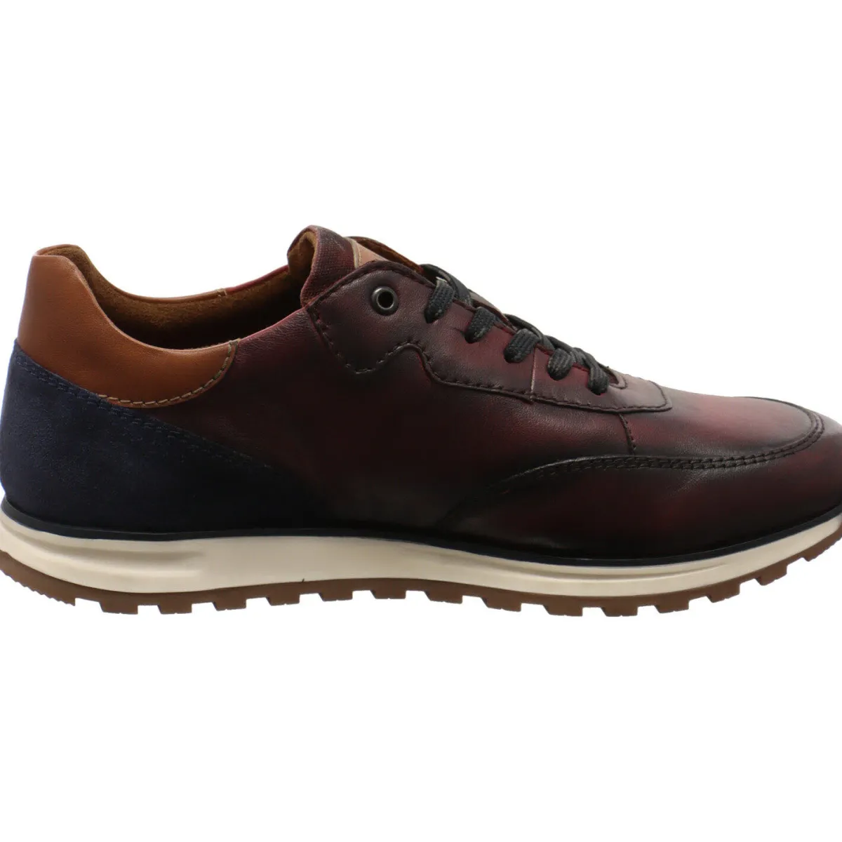 Gefertigt aus hochwertigem Echtleder in dunklem Rot macht der Schuh jede Bewegung individuell mit. Absolute Hingucker dieses Schuhs sind der seitliche Logo-Badge und die Overlayoptik. Einsätze an der Ferse aus Veloursleder in Blau und der Glattleder EInsatz am Schaft in Cognac Braun runden das Design des Schuhs gekonnt ab. Die regulierbare Schnürung ist in einem dunklen Blau abgesetzt und ermöglicht eine einfache Anpassung an den Fuß, während die profilierte Laufsohle für ausreichend Grip sorgt. Der Schaft ist angenehm gepolstert und die Innensohle als Wechselfußbett gearbeitet.