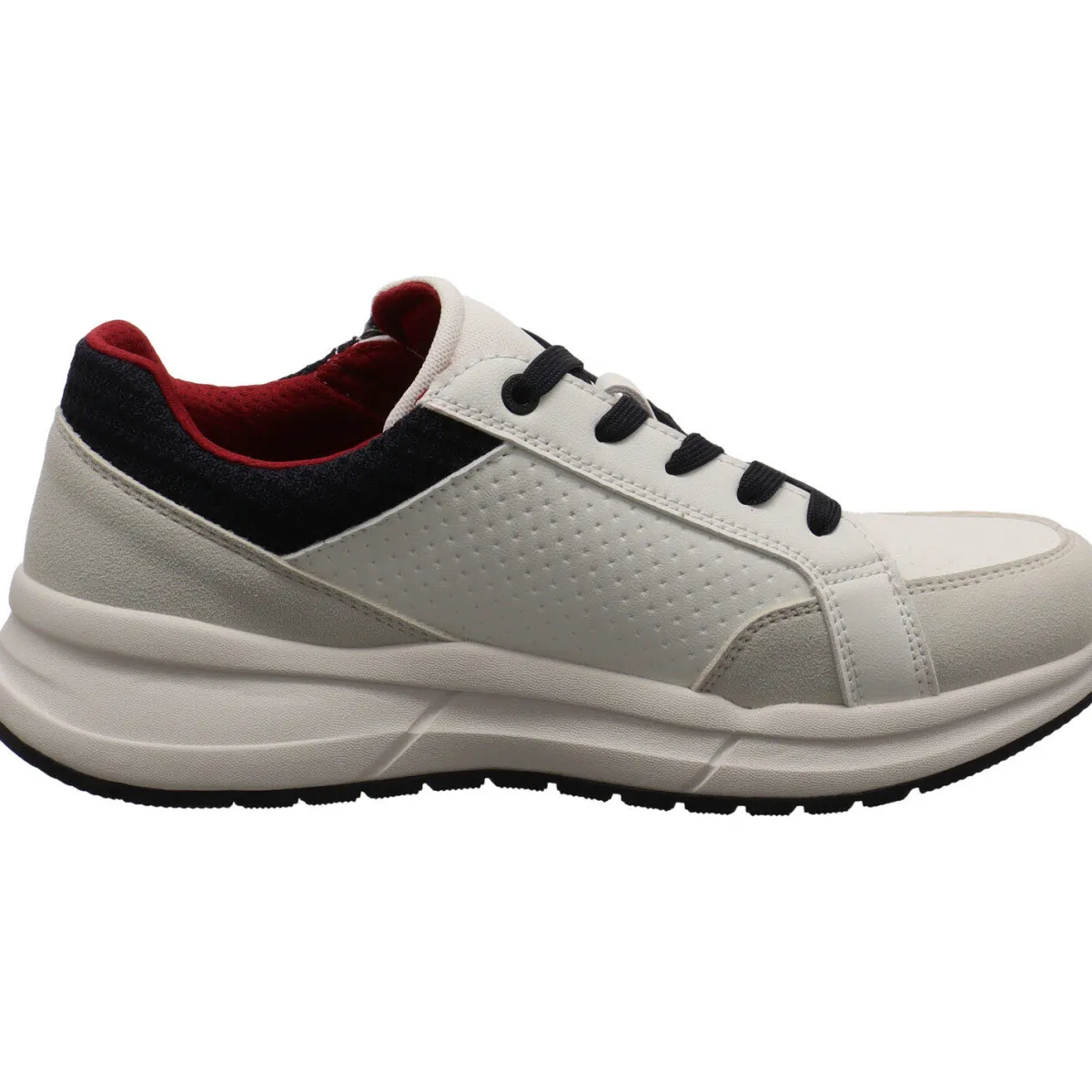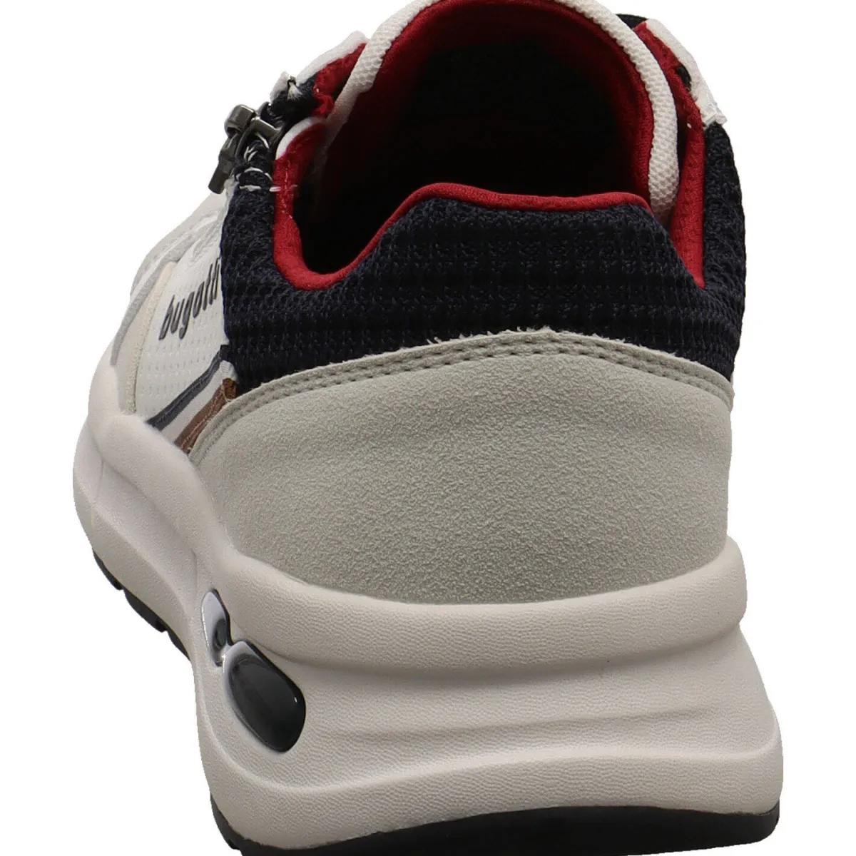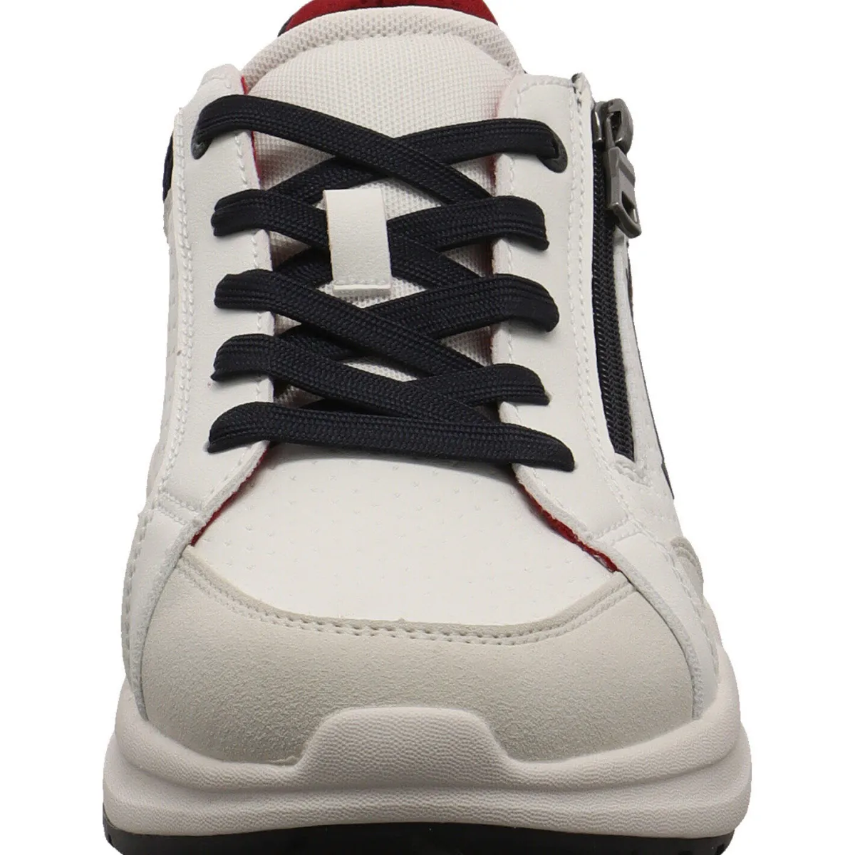 Dabei ist er mit einer individuellen Prägung und dem Marken Logo an der Seite verziert. Der Schaft ist mit einem Textil Mesh Einsatz in Blau versehen und angenehm weich gepolstert. Durch den seitlichen Reißverschluss ist der Einstieg ganz leicht und mit der Schnürung kannst du die Passform auf deine Bedürfnisse anpassen. Die Senkel sind ebenfalls in Blau und das Innenfutter Rot, so entsteht eine tolle Farbkombination, die dem Sneaker sein modernes Design geben. Die Innensohle ist als Wechselfußbett gearbeitet, so können eigene Einlagen verwendet werden.