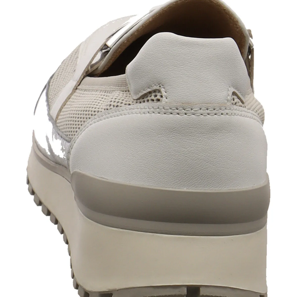 Gefertigt aus einem tollen Mix aus Echtleder und Textil in Weiß ist er seitlich als Netz gearbeitet und bietet dadurch eine tolle Luftzirkulation. Ein Hingucker ist die Metall Applikation über dem Rist. Die Rückseite vom Schaft ist angenehm gepolstert, höher gearbeitet und bietet einen tollen Tragekomfort.
