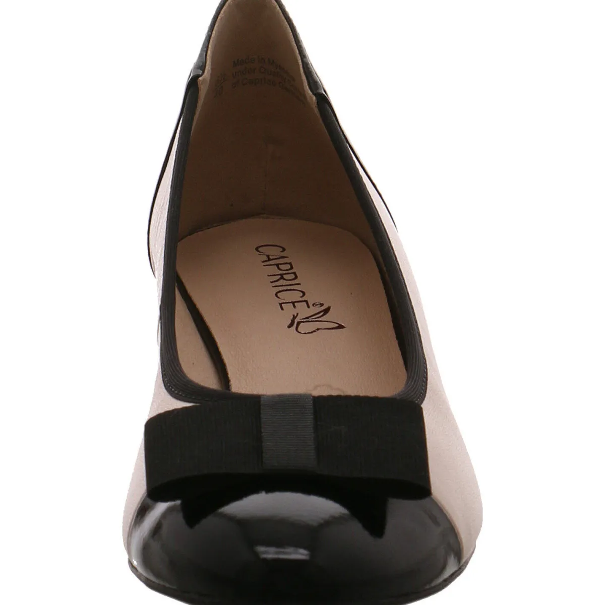 Gefertigt aus einem Mix aus Echtleder und Textil in Beige fällt er besonders durch seine Lack Einsätze in Schwarz an Schuhspitze und Ferse ins Auge. Die breite Schleife aus Textil auf dem Blatt passt perferkt zum Gesamtbild des Schuhs. Stretch Einsätze und die Antishokk Absatzdämpfung vom Blockabsatz bieten dabei ein Höchstmaß an Komfort.