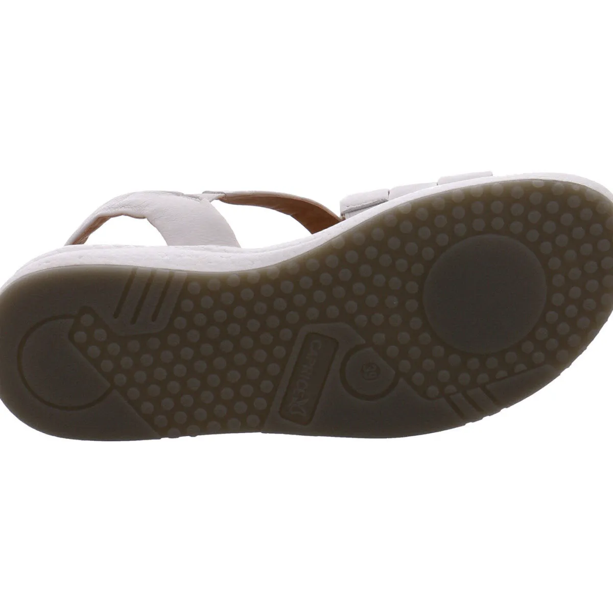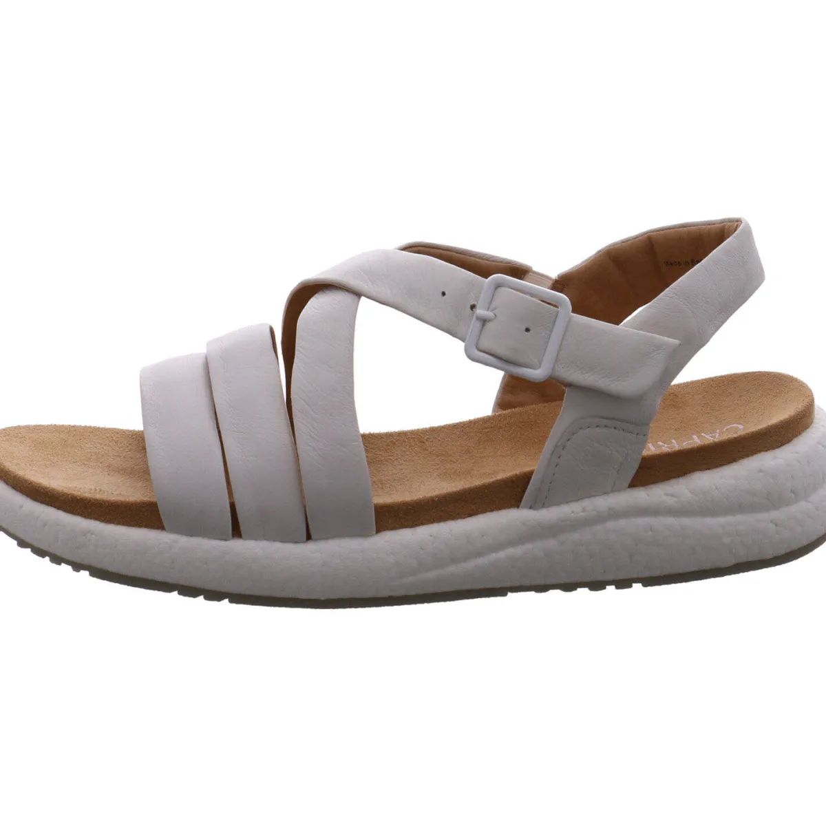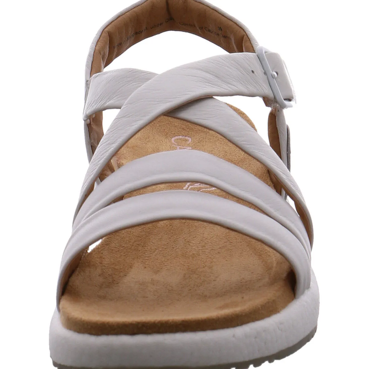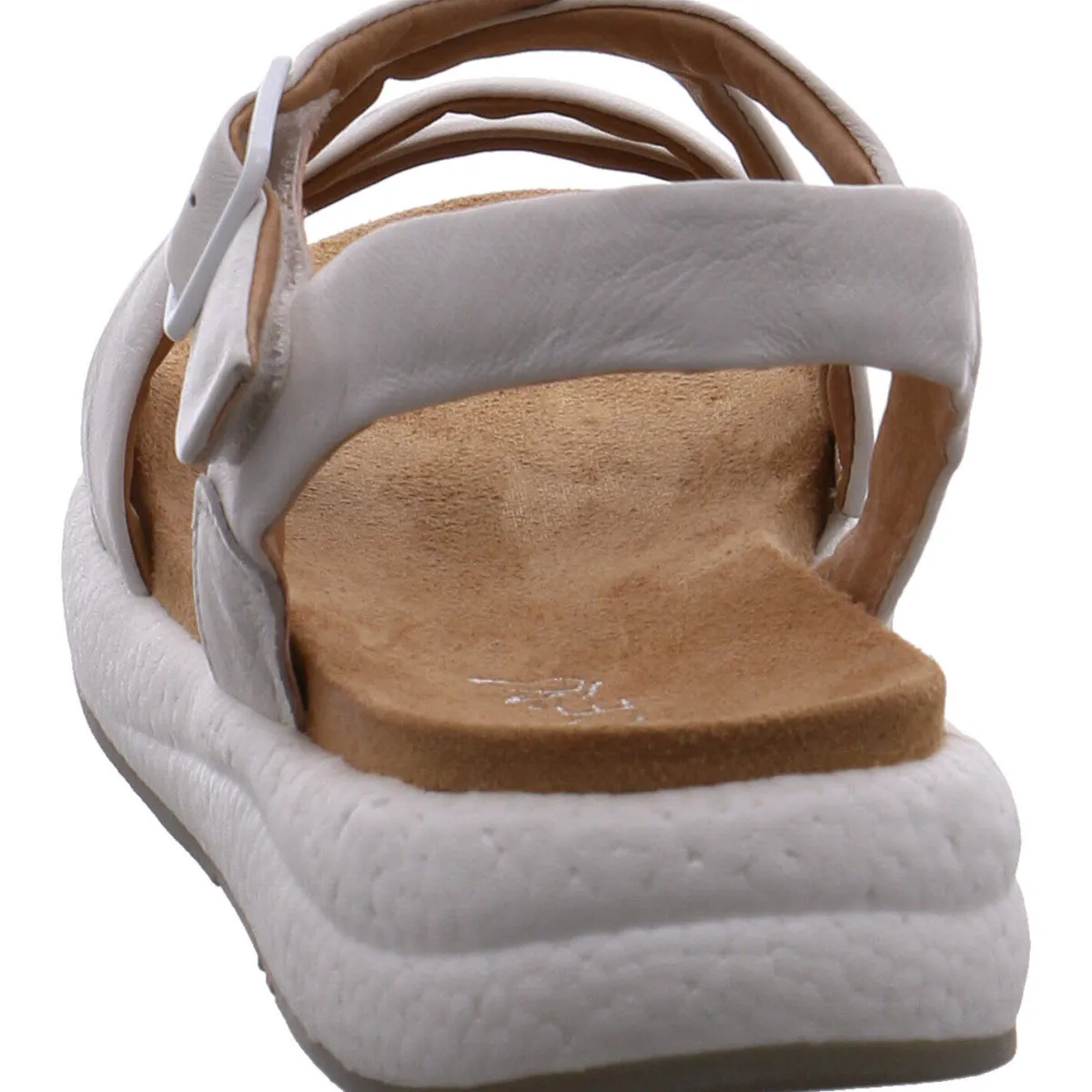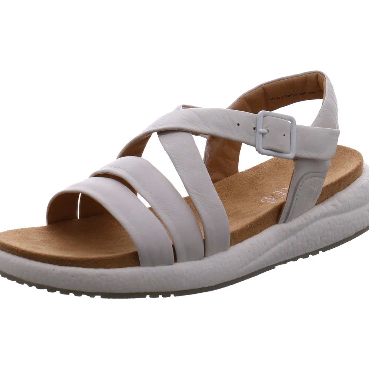 Das Obermaterial aus Echtleder in Weiß zeigt sich in stilvoll gesetzten Riemen, welche einen guten Halt geben. Mit dem dezenten Klettverschluss und dem verstellbaren Riemen, ist der Einstieg besonders leicht und der Riemen kann zusätzlich individuell an den Knöchel angepasst werden. Die Innensohle ist angenehm weich gepolstert.