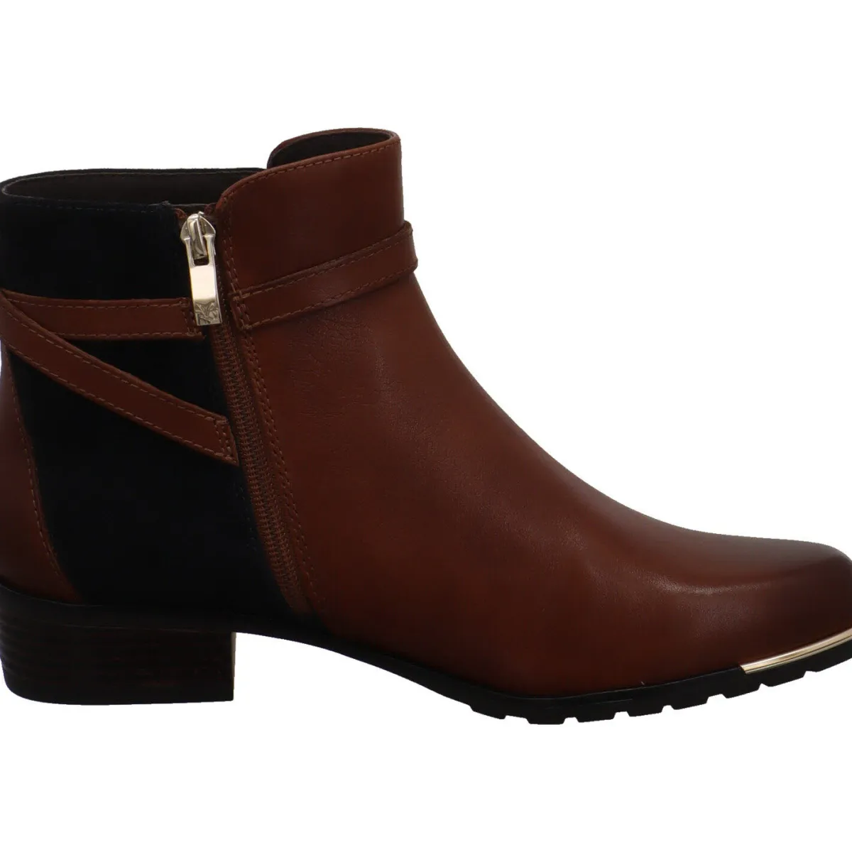 Gefertigt aus hochwertigem Glattleder in Cognac Braun, besticht das Design durch die Einsätze am Schaft aus Veloursleder in Blau. Zusätzliche Eyecatcher ist Riemen um den Schaft welcher mit einer Schnalle in Gold verziert ist. Die Schuhspitze ist zusätzlich mit einem goldenen Einsatz versehen und gibt dem Schuh das gewisse Etwas.