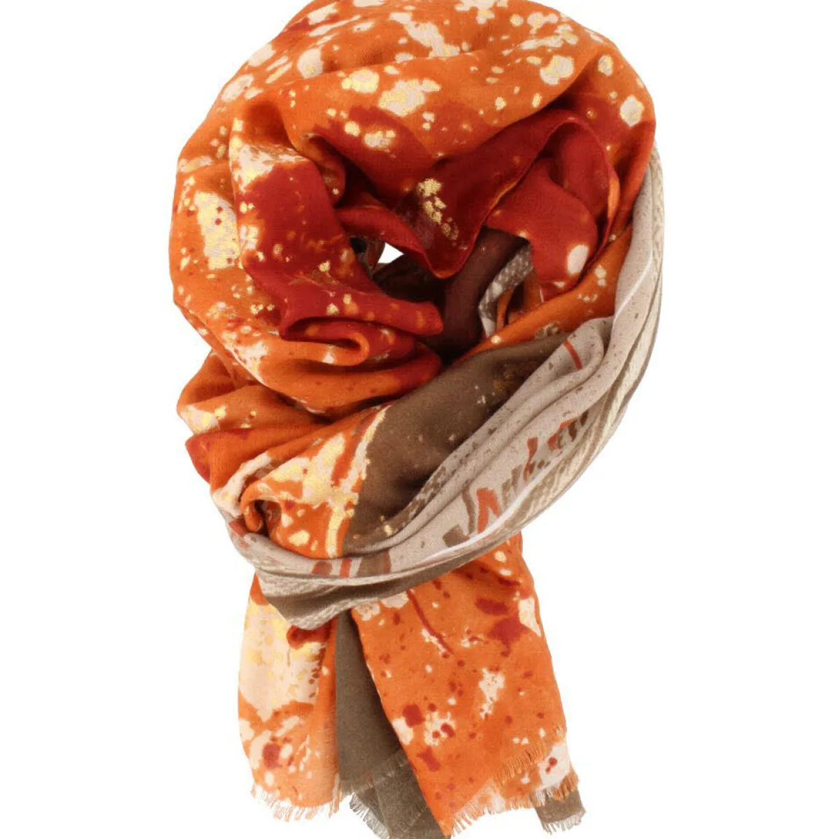 Das Design in verschiedenen Orange und Rot Tönen in Kombination mit den Details in Gold und dem tollen Muster mit Braun fügt sich hervorragend in die Garderobe ein und macht dieses Tuch zum unverzichtbaren Accessoire für die neue Saison.