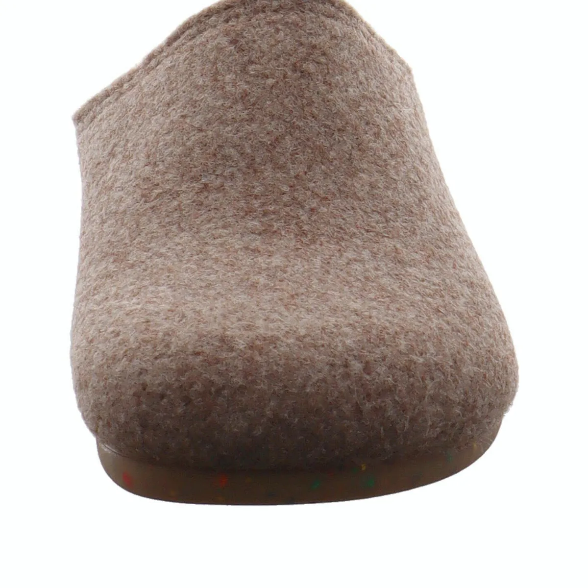 Das Obermaterial aus recycelten PET Flaschen, in Beige, hat die Haptik von Filz. Durch das Wechselfußbett eignet er sich auch wunderbar für lose Einlagen. Die Gummisohle begeistert durch ihre Bunten Einschlüsse und gibt perfekten Halt, so kommst du auch auf glatten Böden nicht ins Rutschen.