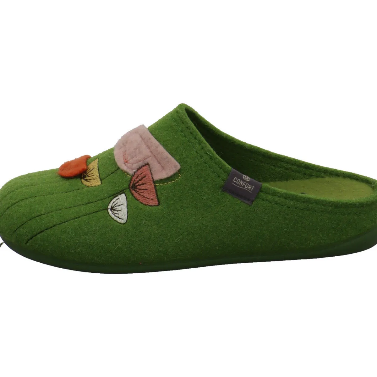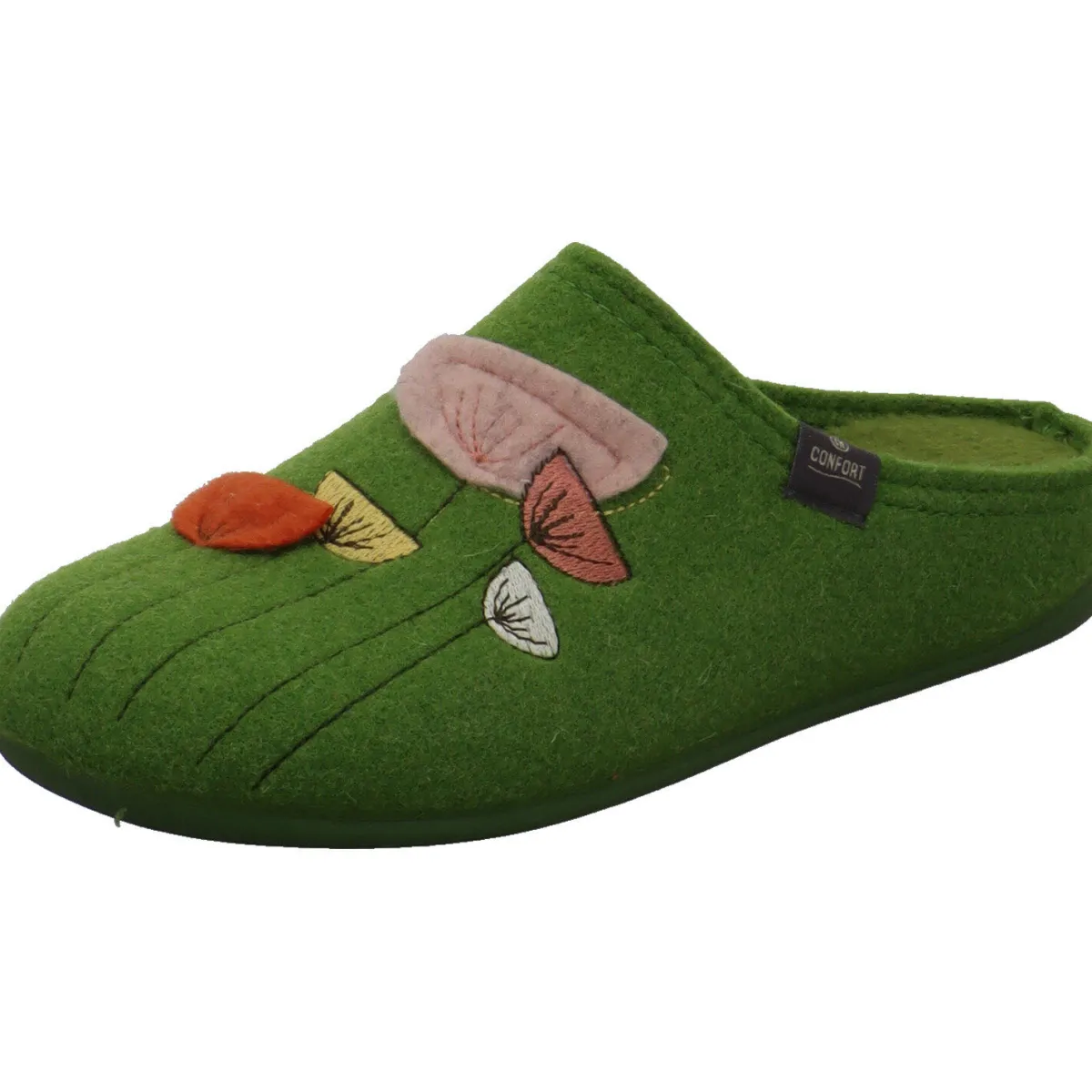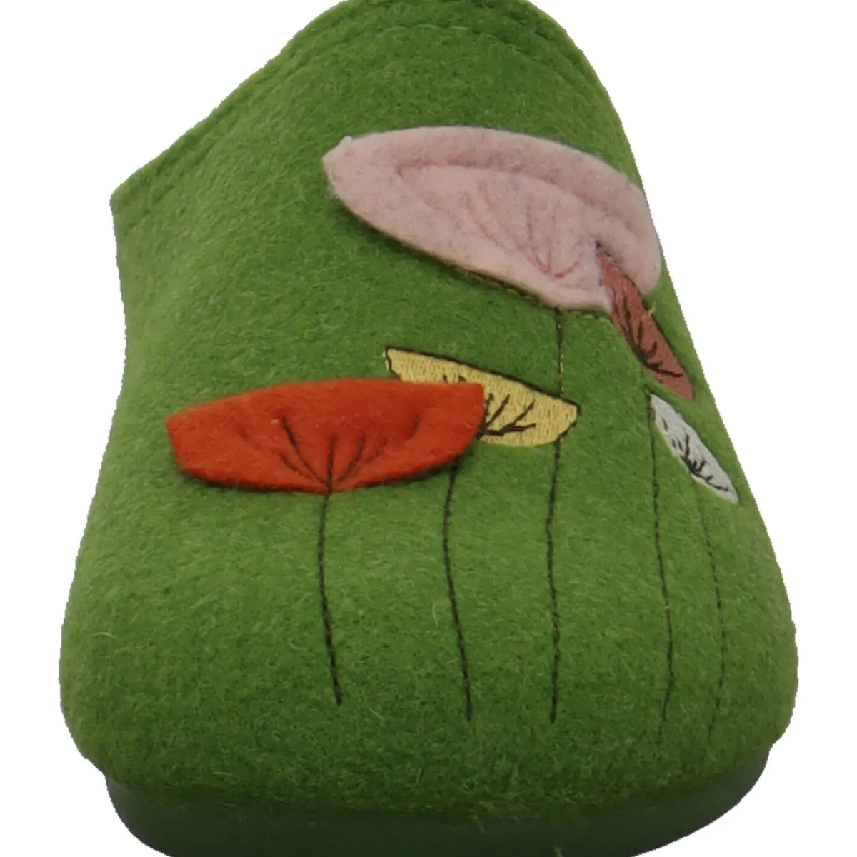 Das Obermaterial aus Textil Filz in Grün ist auf dem Blatt mit einer Strickerei verziert, die Blumen darstellt.