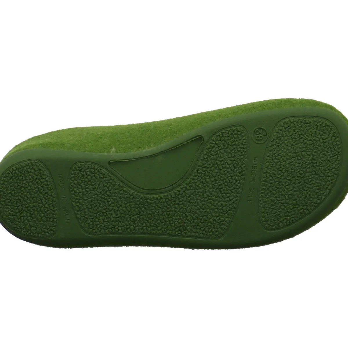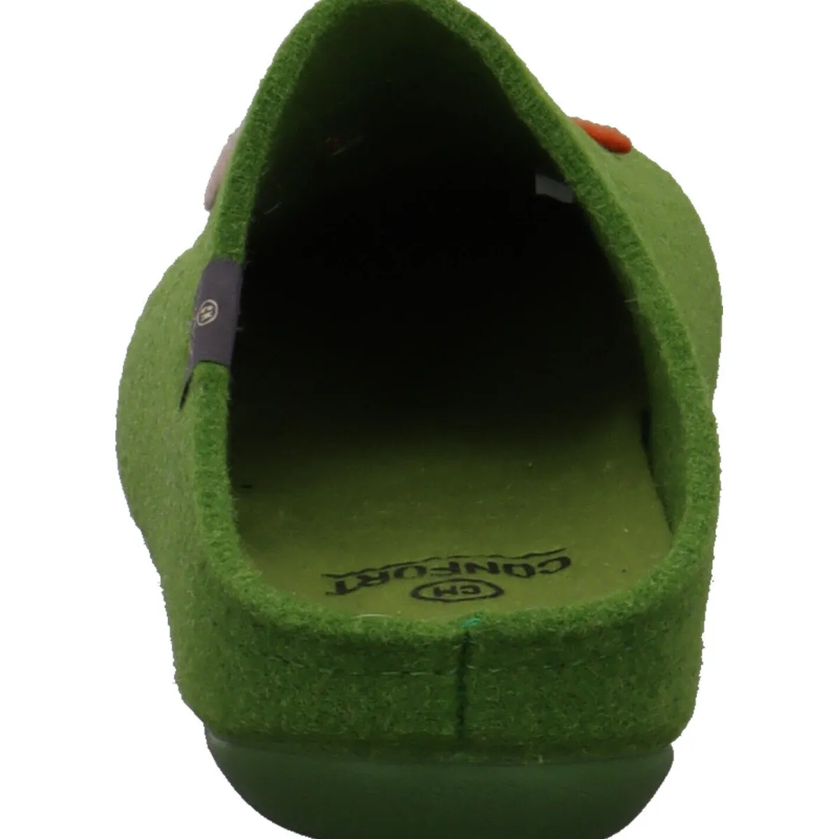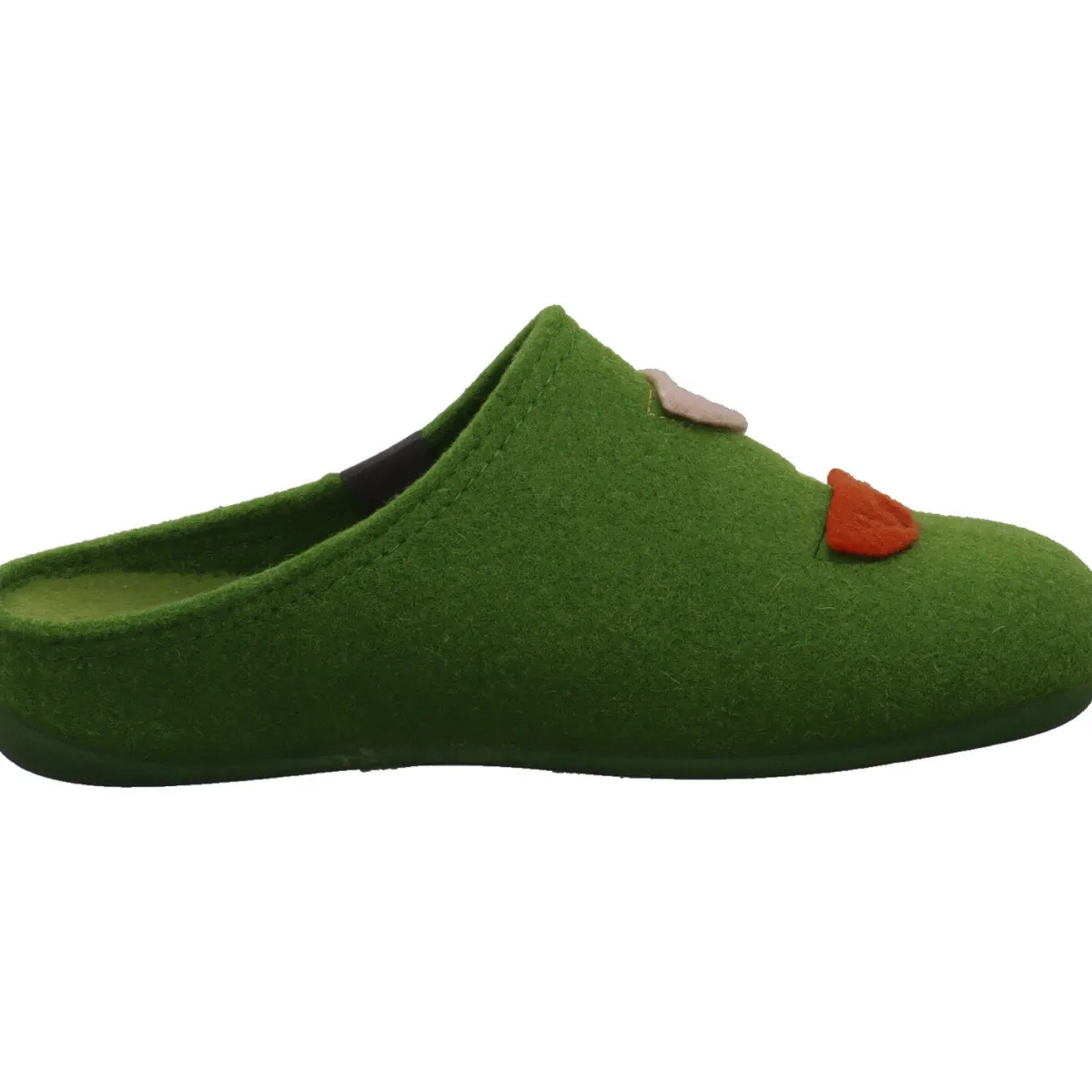 Das Obermaterial aus Textil Filz in Grün ist auf dem Blatt mit einer Strickerei verziert, die Blumen darstellt.