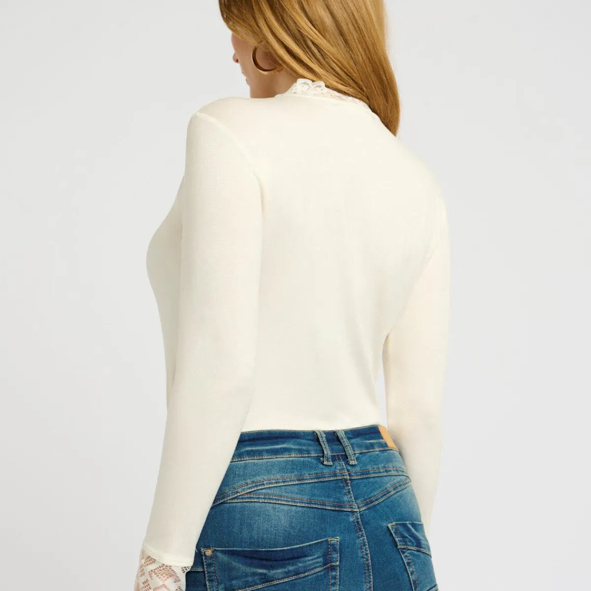 Das Langarmshirt in Beige, Creme begeistert durch seine Einsätze in Spitze an den Ärmeln und am Ausschnitt.