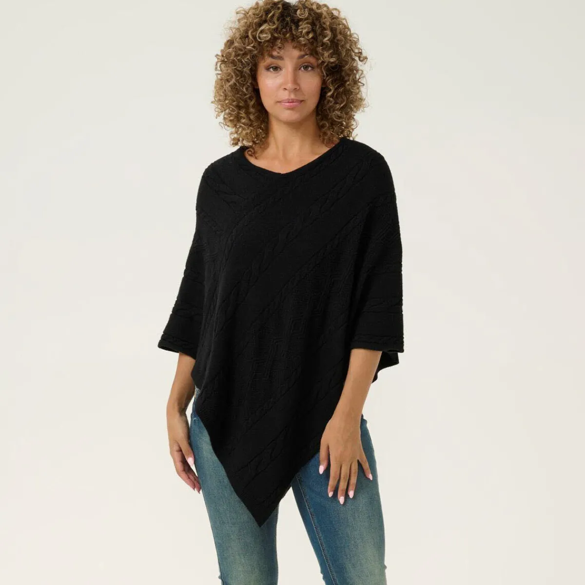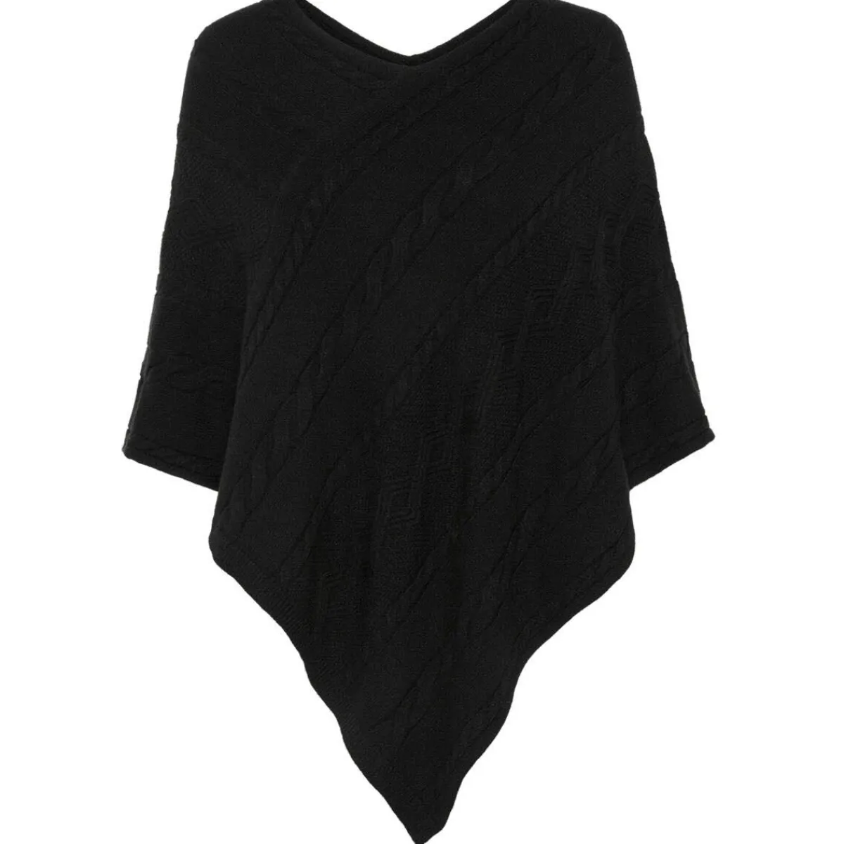 Das Strick Gewebe in Schwarz ist mit einem schönen Zopf Muster verziert und einem Rundhals Ausschnitt versehen.