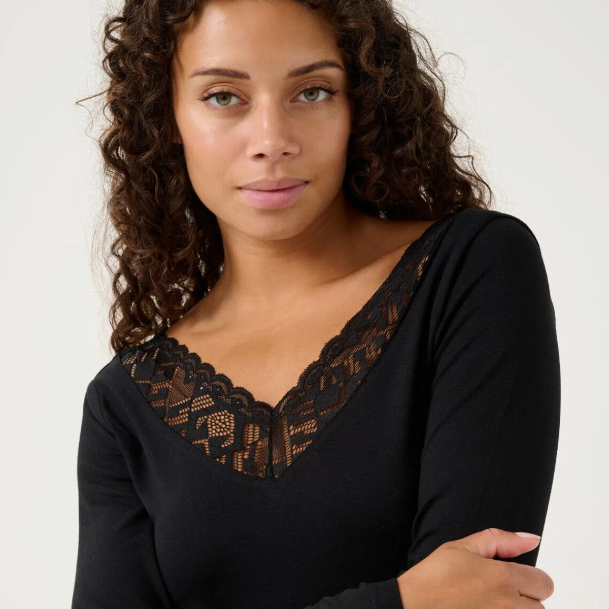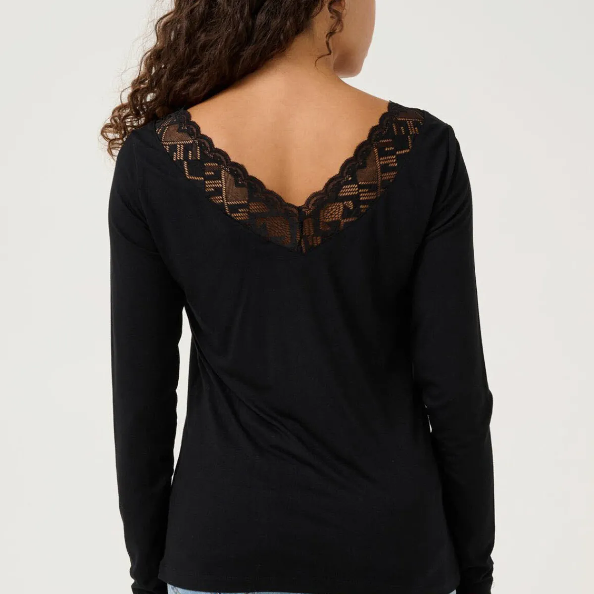 Das Design in Schwarz ist schlicht gehalten und komplettiert jedes Outfit perfekt. Ein Hingucker ist dabei der V-Ausschnitt, welcher mit schöner Spitze unterlegt ist.