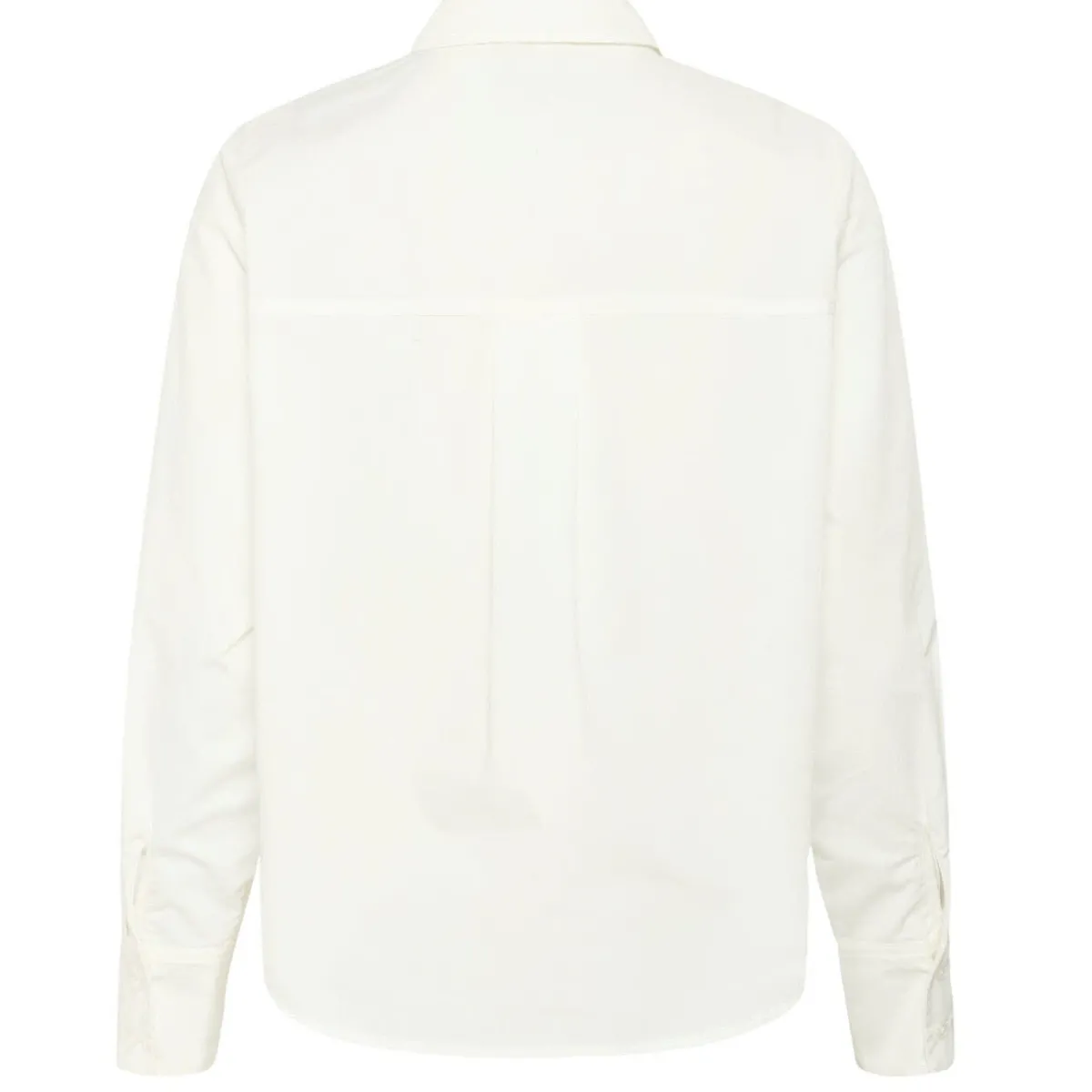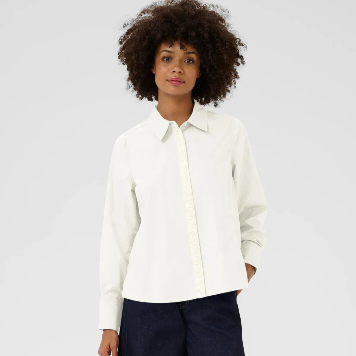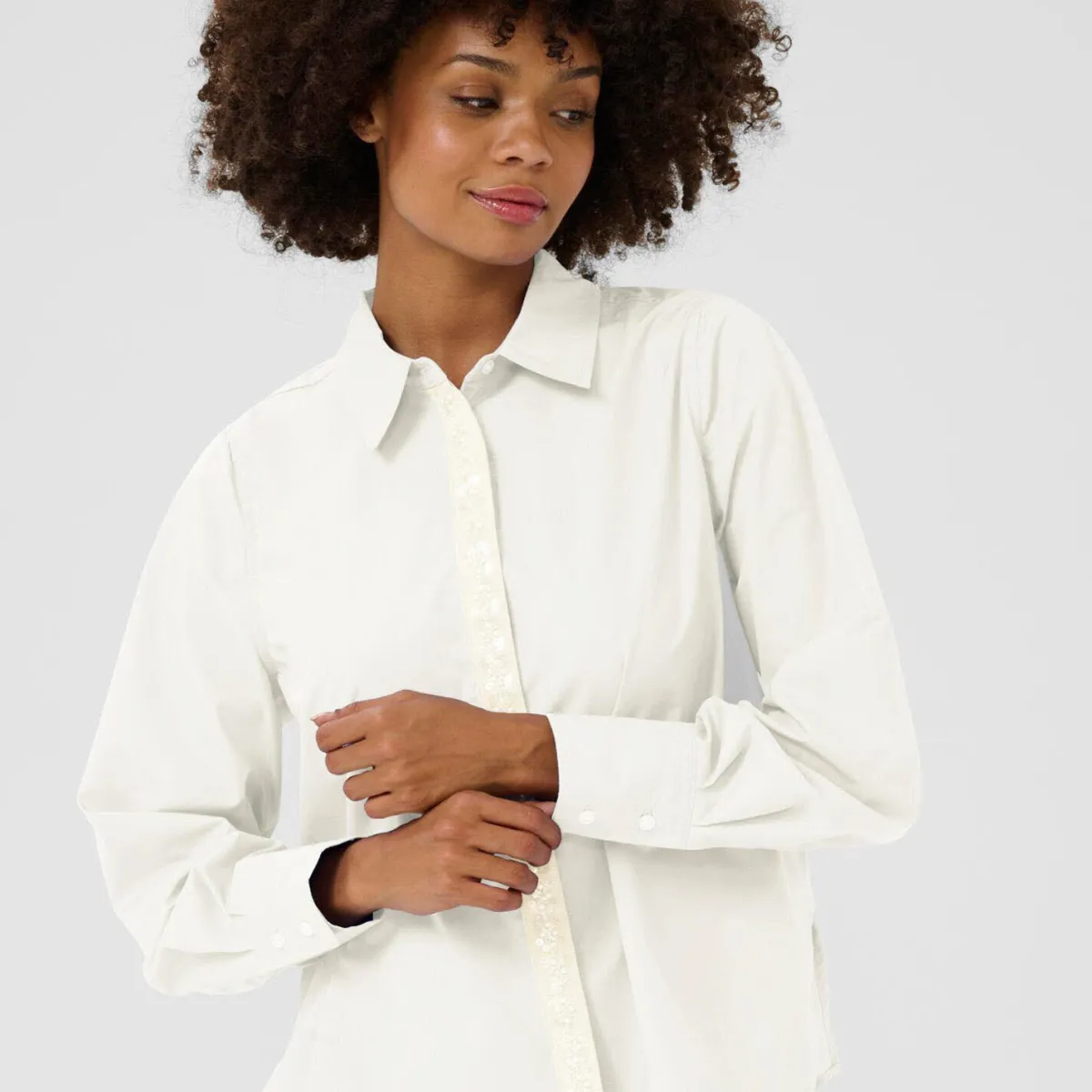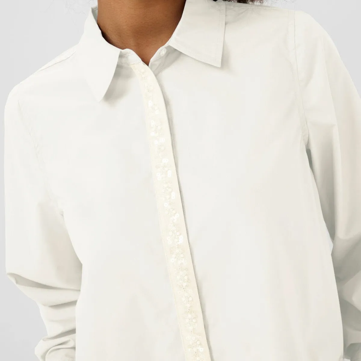 Das Mischgewebe mit Baumwolle in Creme Weiß ist durch den Oversize Schnitt besonders bequem. Die Bluse hat einen klassischen Kragen und lange Ärmel. Die Knopfleiste auf der Vorderseite ist durch eine Leiste verdeckt, diese ist mit kleinen Perlen und Pailletten verziert und machen sie zu einem Eyecatcher.