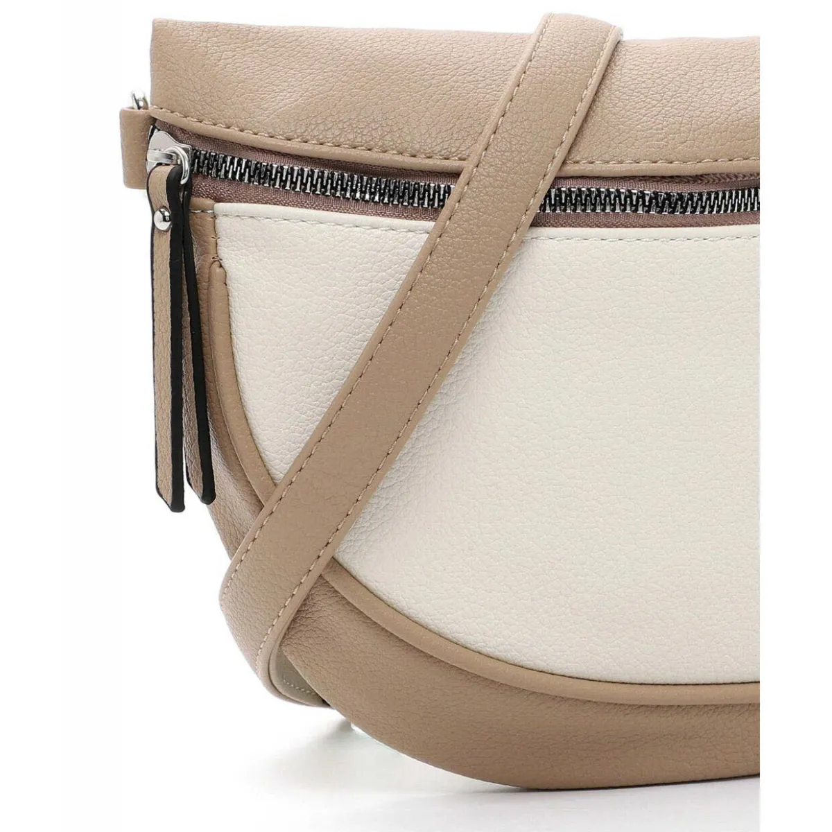 Edel verarbeitetes Kunstleder in Beige und Braun wurde mit einer angenehmen Haptik versehen, die der Umhängetasche das gewisse Etwas verleiht. Durch den verstellbaren und abnehmbaren Umhängegurt kannst du die Tasche auch crossover tragen.