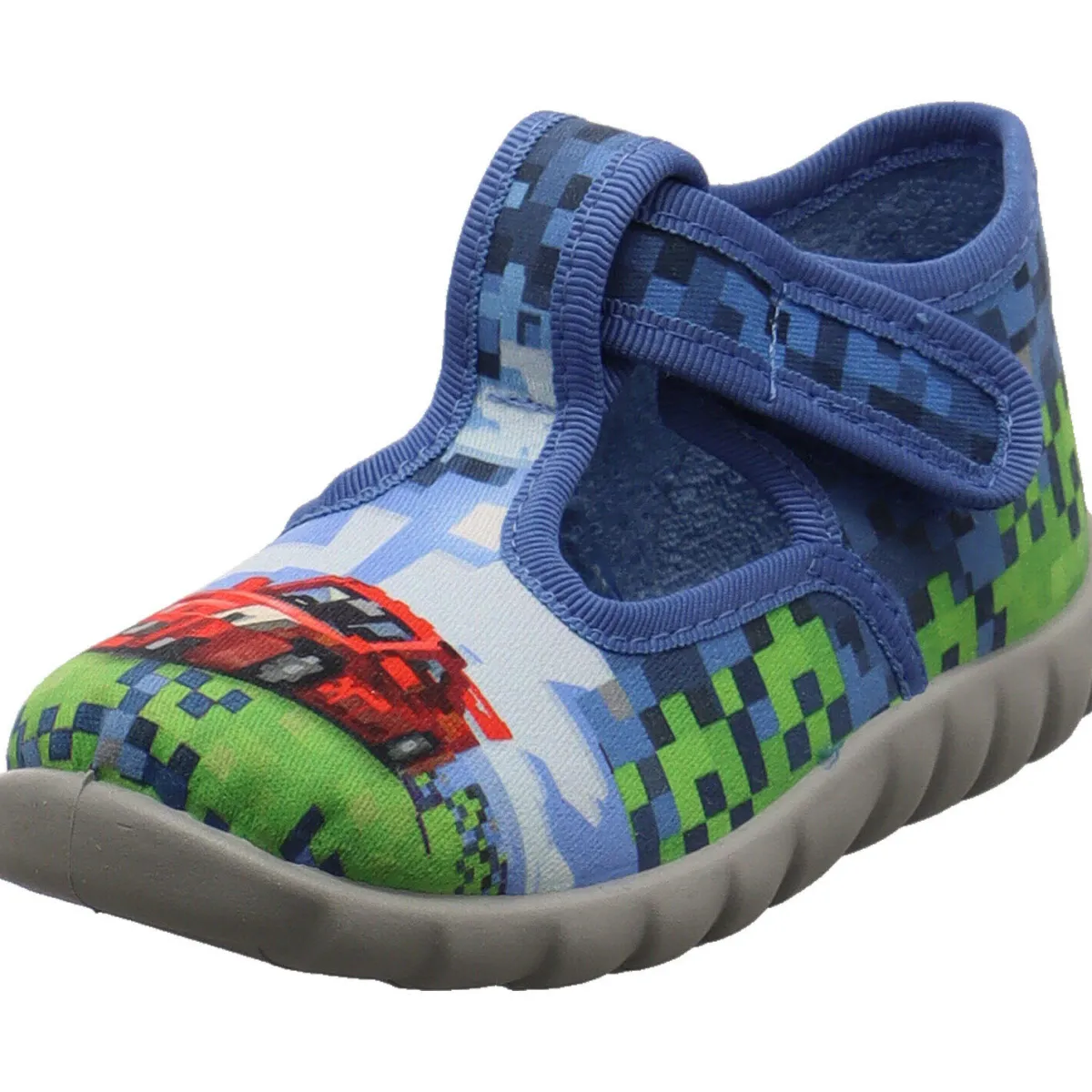Es wurde aus strapazierfähiger Baumwolle in Blau gearbeitet. Auf dem Blatt ist ein Auto als Print in Rot und an den seiten sind kleine Pixel in Grün und Schwarz. Durch den seitlichen Klettverschluss ist das An- und Ausziehen ein Kinderspiel. Der leicht erhöhte Schaft gibt den notwendigen Halt. Das Innenfutter ist aus angenehm weichen Frottee Futter gearbeitet. Kleine Cutouts und die Perforierung der Laufsohle sorgen zusätzlich für eine optimale Belüftung. Die Flexi-B Gummilaufsohle ist rutschhemmend und dennoch super flexibel und leicht.