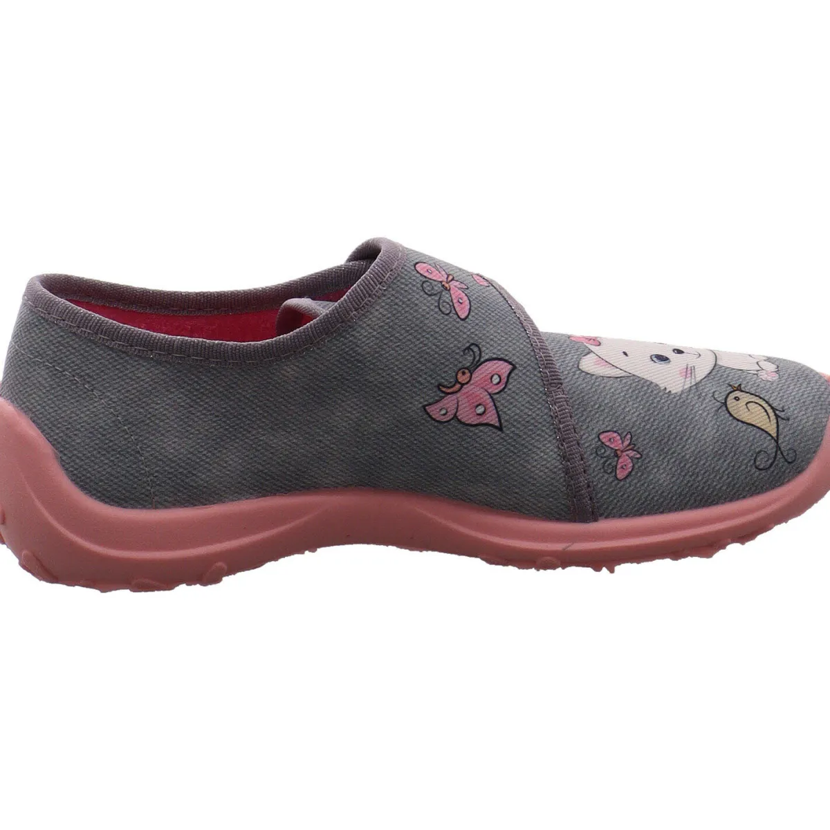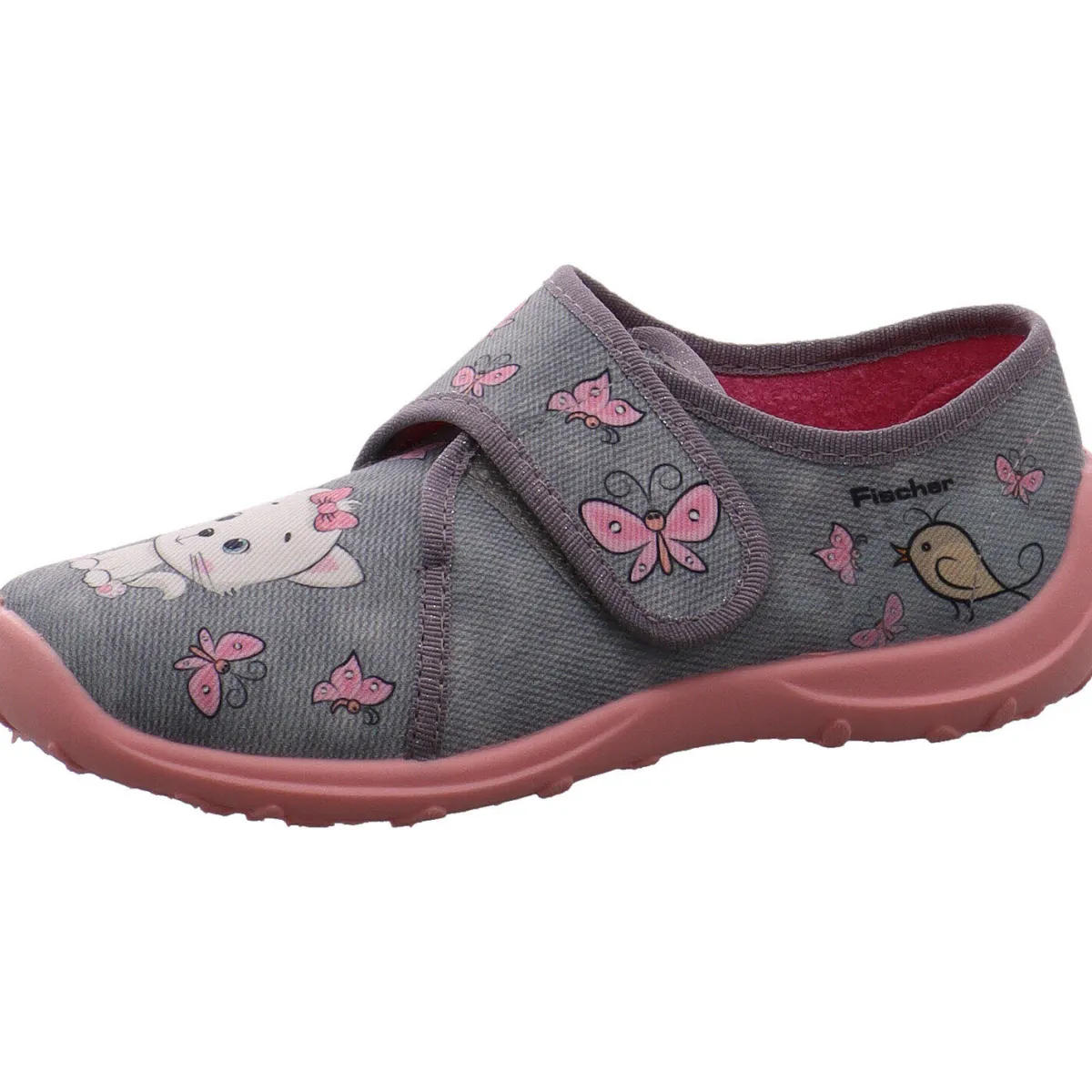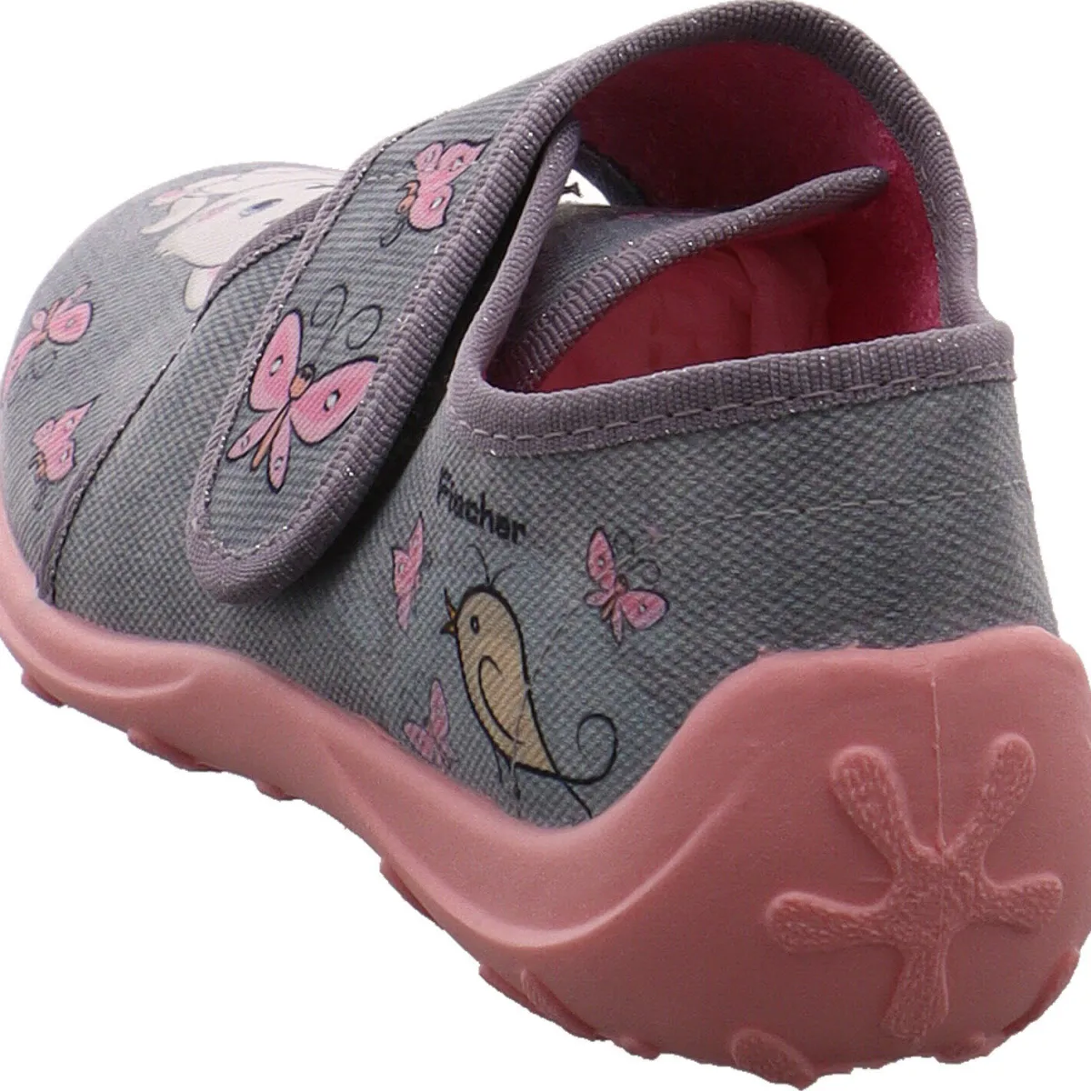 Der Schuh ist aus Textil in Grau gefertigt und sehr leicht. Zudem lässt er sich durch den seitlichen Klettverschluss leicht an- und ausziehen, was beim Spielen oft von Vorteil ist. Die Touch Me Innensohle und das Frottee Innenfutter, sind angenehm weich gepolstert.