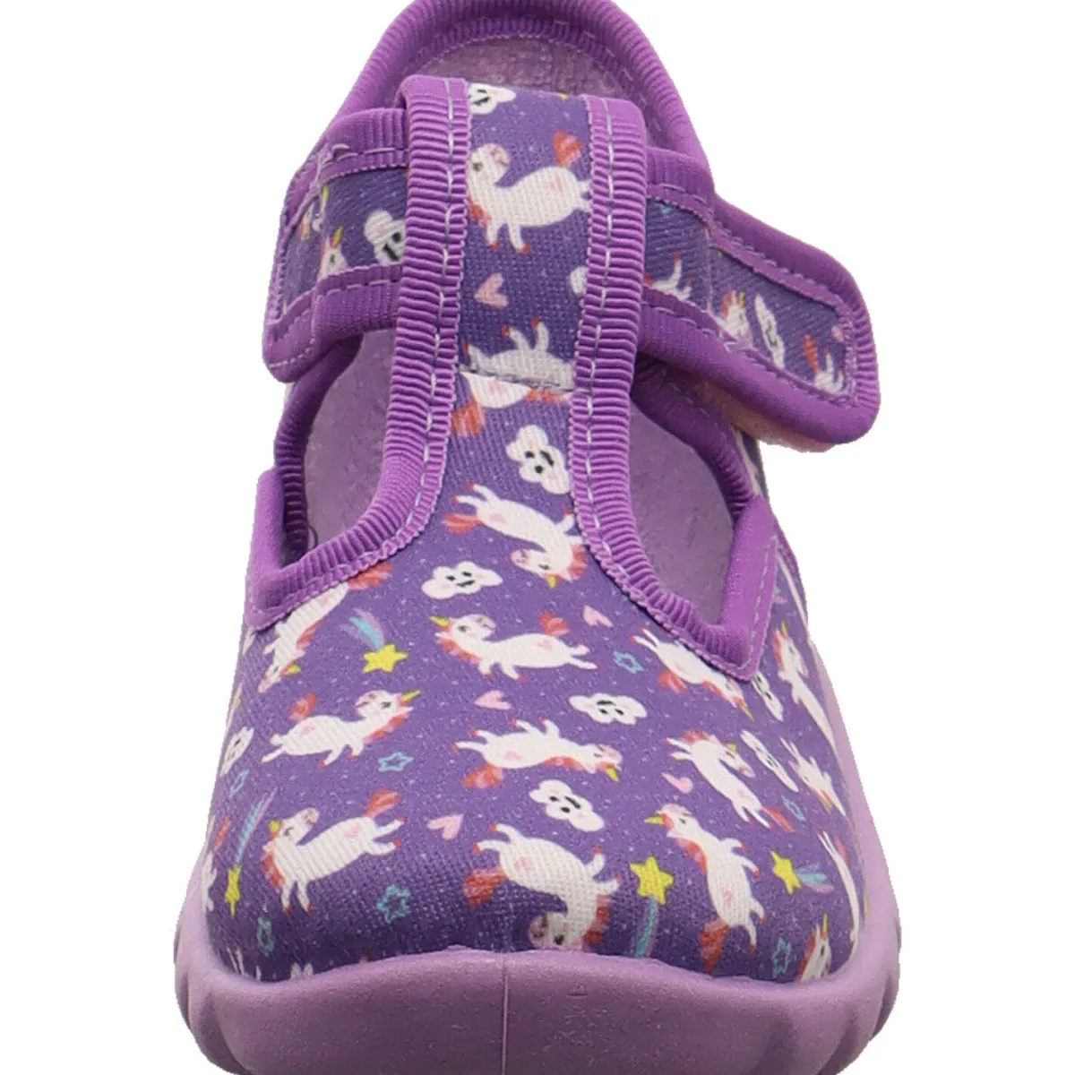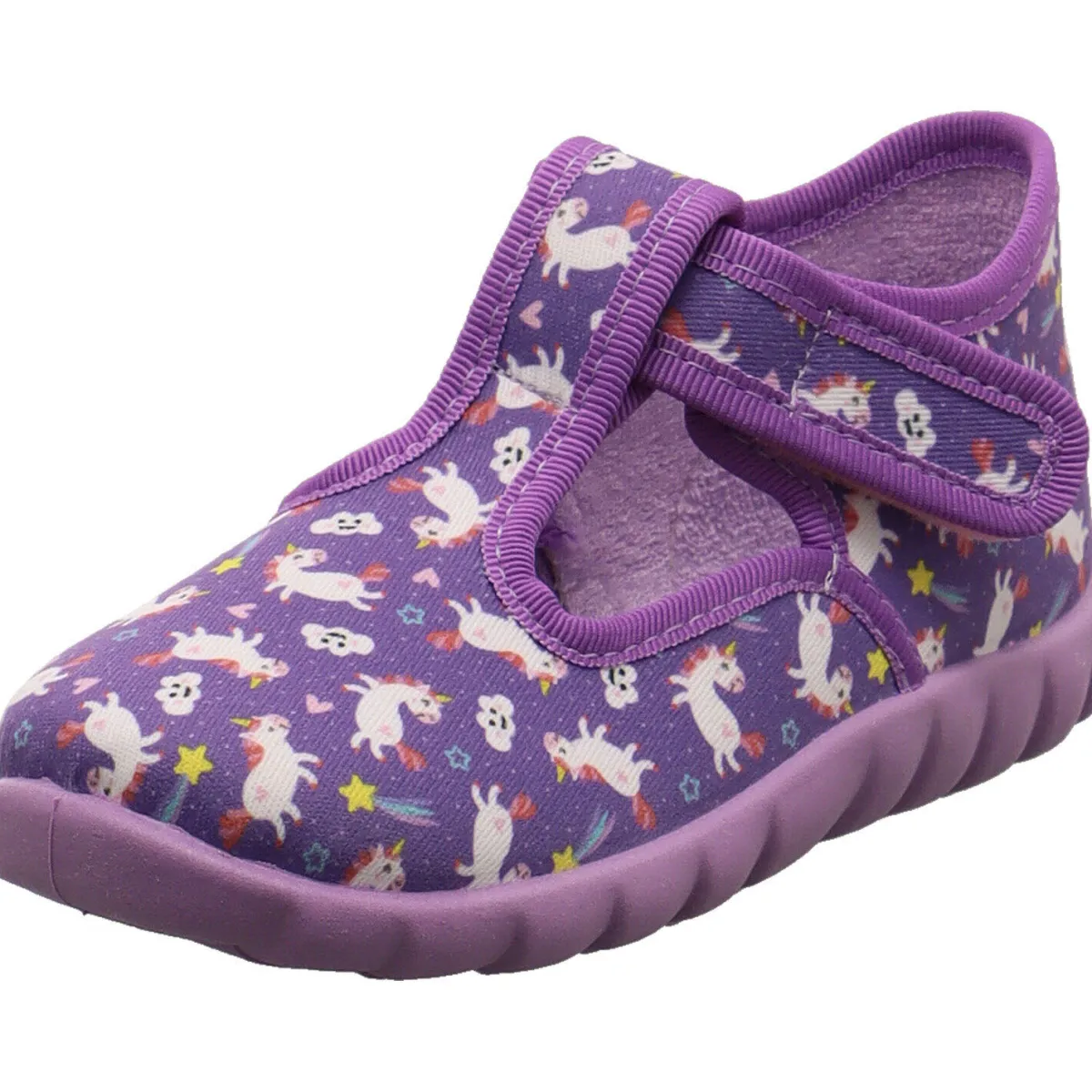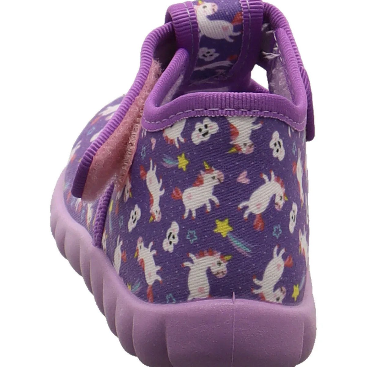 Es wurde aus strapazierfähiger Baumwolle in Lila gearbeitet. Auf dem Blatt ist Allover Print mit kleinen Einhörnern. Durch den seitlichen Klettverschluss ist das An- und Ausziehen ein Kinderspiel. Der leicht erhöhte Schaft gibt den notwendigen Halt. Das Innenfutter ist aus angenehm weichen Frottee Futter gearbeitet. Kleine Cutouts und die Perforierung der Laufsohle sorgen zusätzlich für eine optimale Belüftung. Die Flexi-B Gummilaufsohle ist rutschhemmend und dennoch super flexibel und leicht.