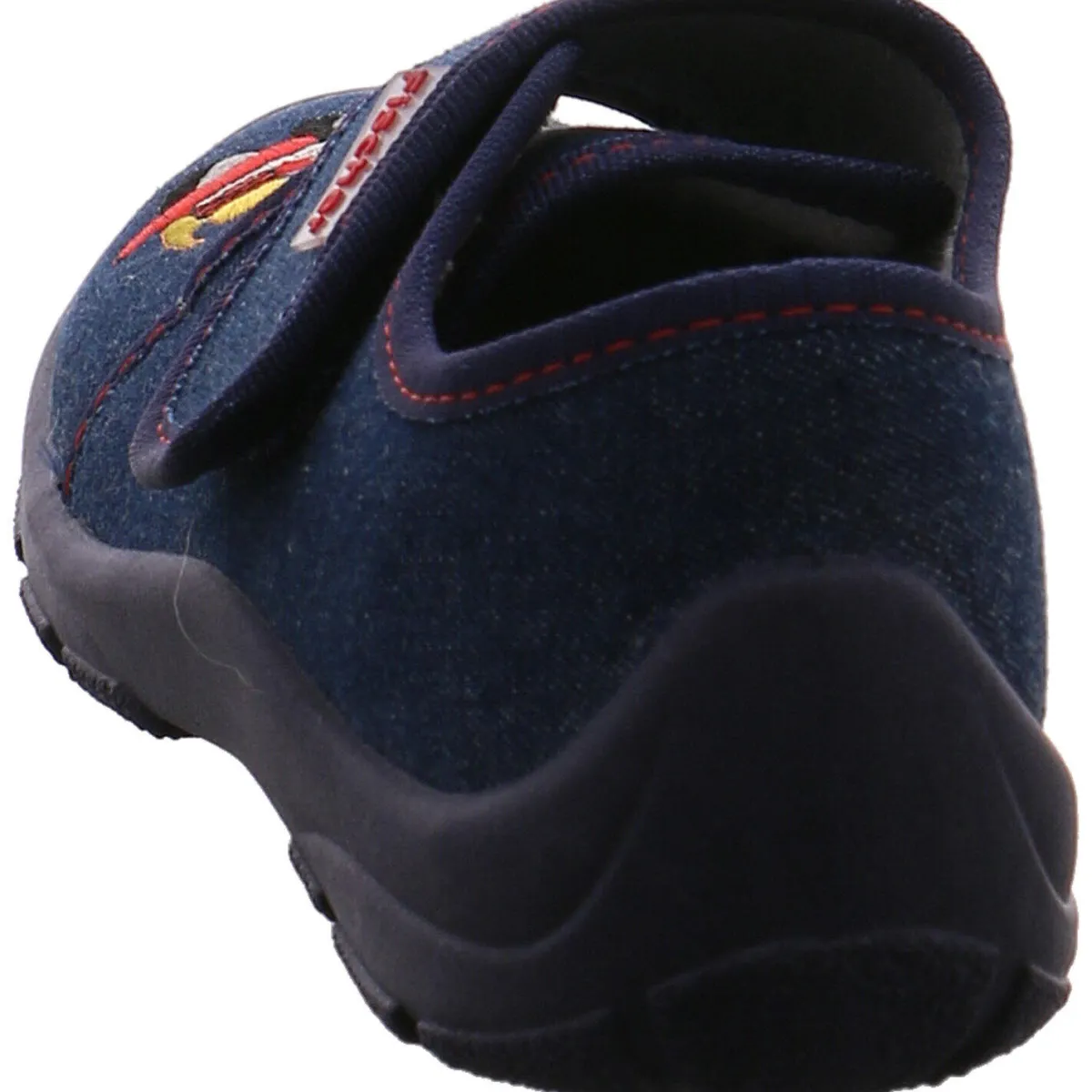 Der Schuh ist aus strapazierfähigem Textil in Denim Blau gefertigt, innen leicht frottiert und sehr leicht. Zudem lässt er sich durch den seitlichen Klettverschluss leicht an- und ausziehen, was beim Spielen oft von Vorteil ist.