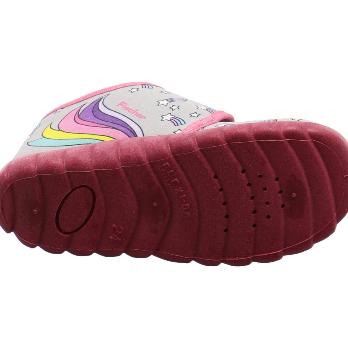 Der Schuh ist aus strapazierfähigem Textil in Grau gefertigt. Absoluter Hingucker ist dabei das Einhorn auf dem Blatt und der Schweif an der Seite in Bunt. Kleine Sternschnuppen und die Textil Kanten in Rosa mit Glitzer Effekt runden das verspielte Design perfekt ab. Er ist mit einem Frottee Innenfutter versehen und sehr leicht. Zudem lässt er sich durch den seitlichen Klettverschluss leicht an- und ausziehen, was beim Spielen oft von Vorteil ist.