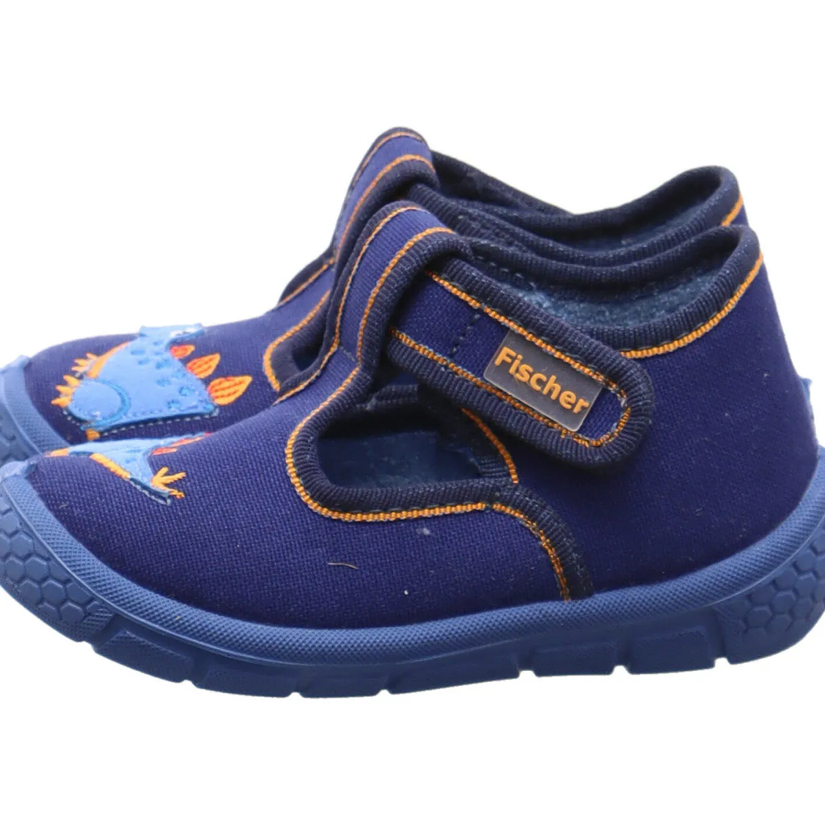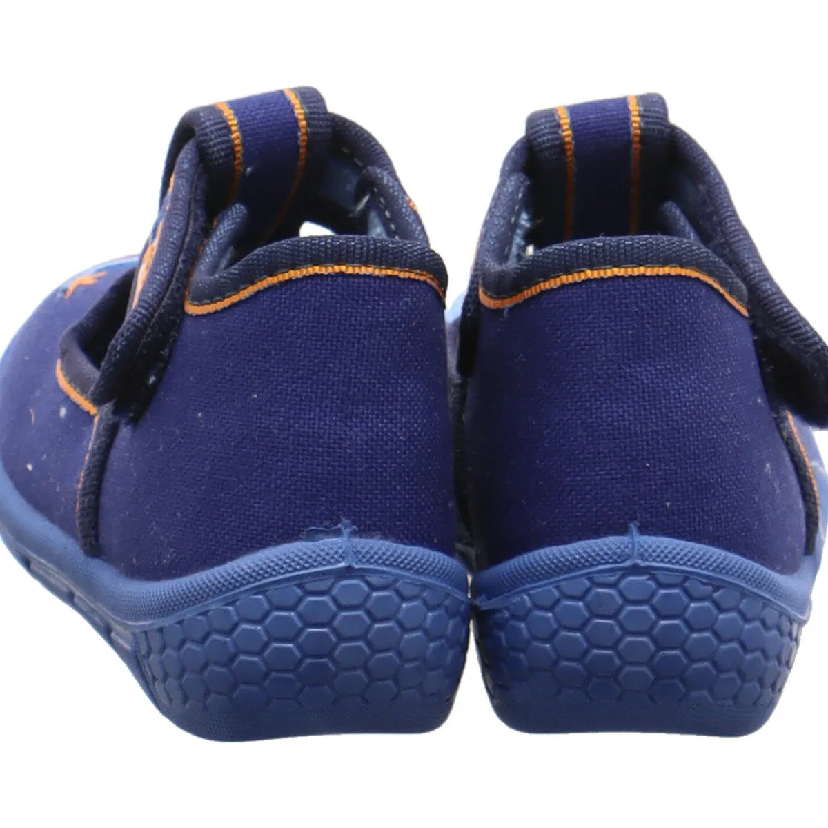 Der Schuh ist aus strapazierfähiger Baumwolle in dunklem Blau gefertigt, innen frottiert und sehr leicht. Zudem lässt er sich durch den seitlichen Klettverschluss leicht an- und ausziehen, was beim Spielen oft von Vorteil ist. Die seitlichen Cutouts sorgen zusätzlich für ein gutes Fußklima. Die Touch Me Decksohle ist extra gepolstert um ein angenehmes Tragen zu gewährleisten.