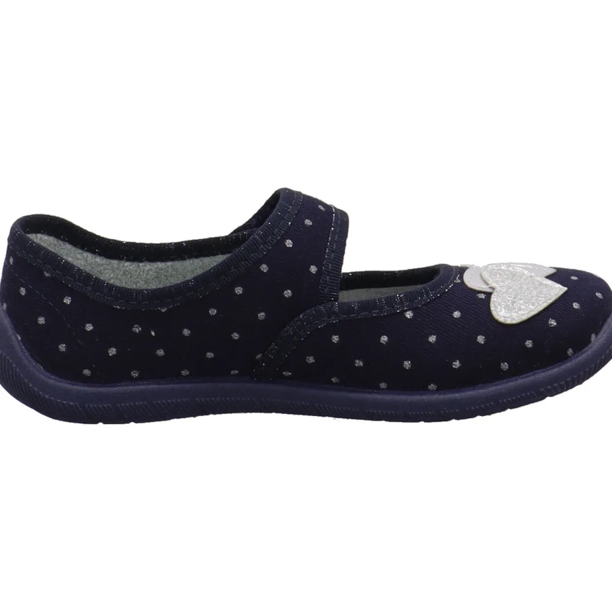 Das robuste Textil Obermaterial in Blau ist mit Punkten verziert die glitzern. Auf dem Blatt sind zwei Herzen in Silber, als Applikation angebracht, von denen einer ebenfalls mit Glitzer verziert ist. Der Riemen über dem Rist ist mit einem Klettverschluss versehen. So ist das An- und Ausziehen kinderleicht und er gibt zusätzlichen Halt. Der Schuh hat eine schmale Schnittform und eine TouchMe Innensohle. Diese bietet mit dem Frottee Innenfutter einen tollen Tragekomfort. Die Laufsohle ist leicht profiliert und gibt Halt, ist dabei super flexibel und leicht.