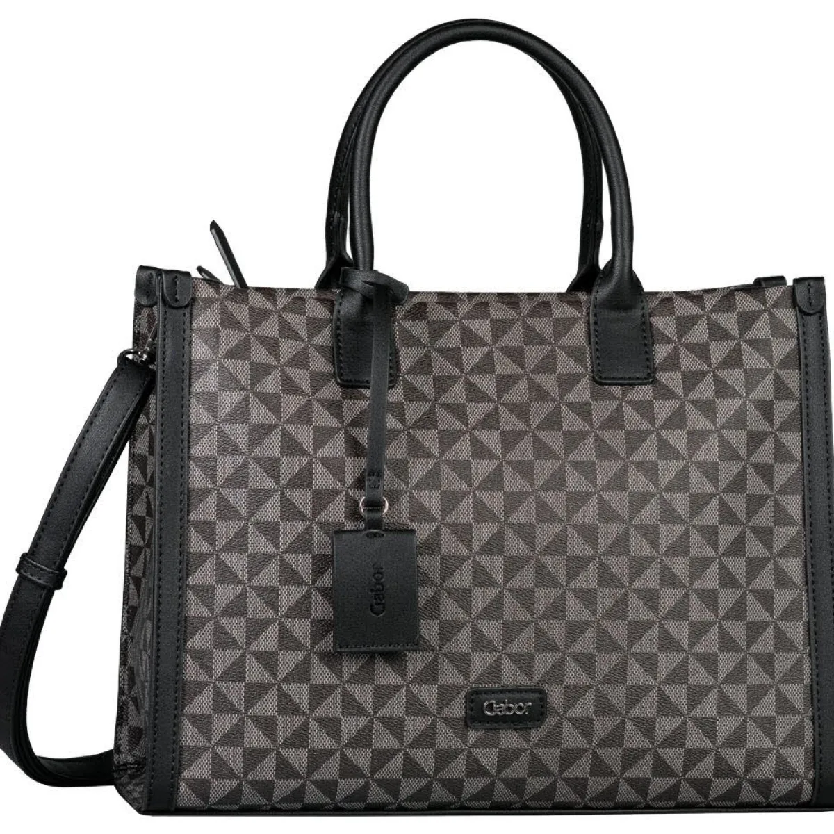 Die Handtasche wurde aus pflegeleichtem Kunstleder in Schwarz und Braun gefertigt und mit einem grafischen Allover Print versehen. Die Tasche ist durch ihr stilvolles Design ein besonderer Blickfang und begleitet dich besonders edel in der Freizeit und ins Büro.