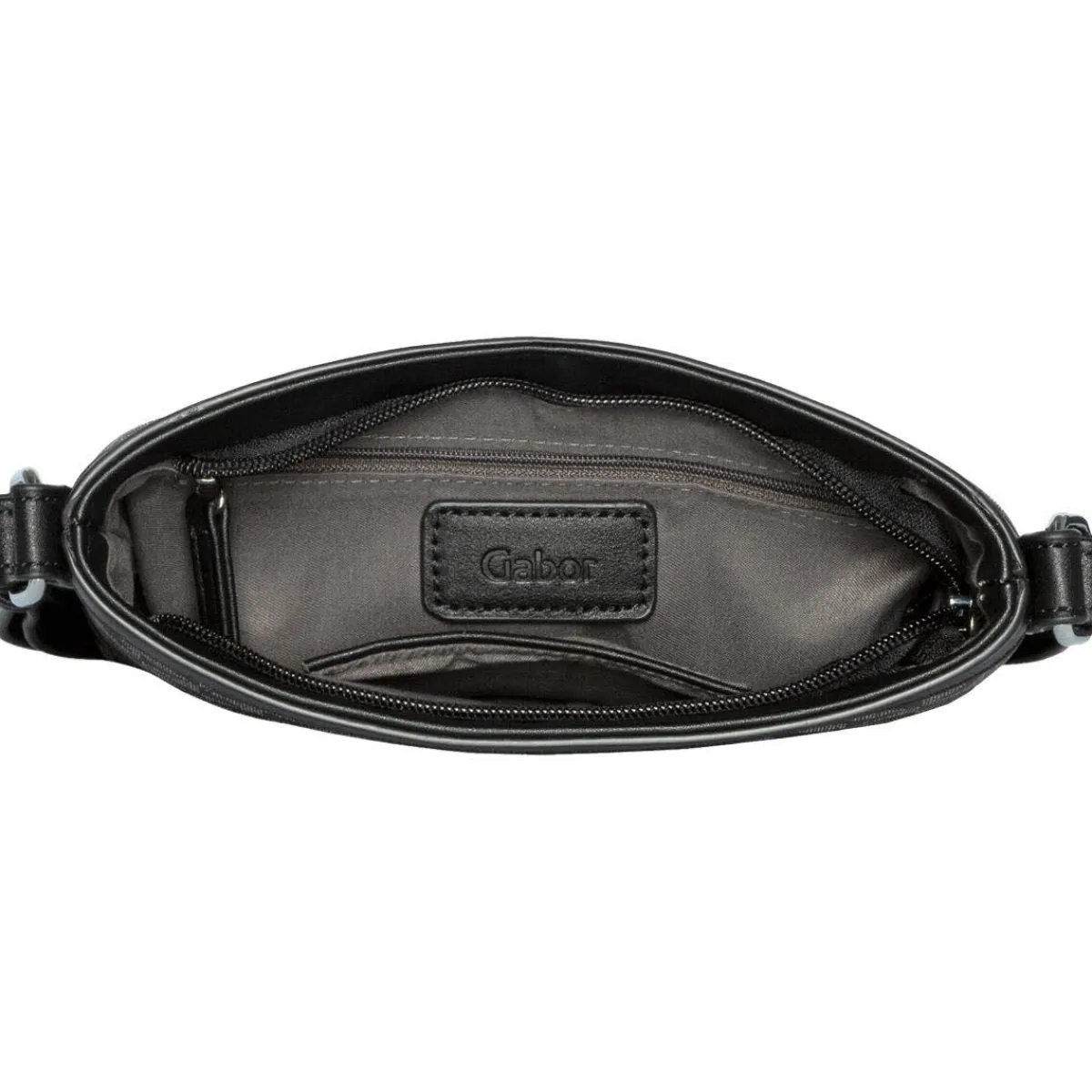 Die Handtasche wurde aus pflegeleichtem Kunstleder in Schwarz und Braun gefertigt und mit einem grafischen Allover Print versehen.