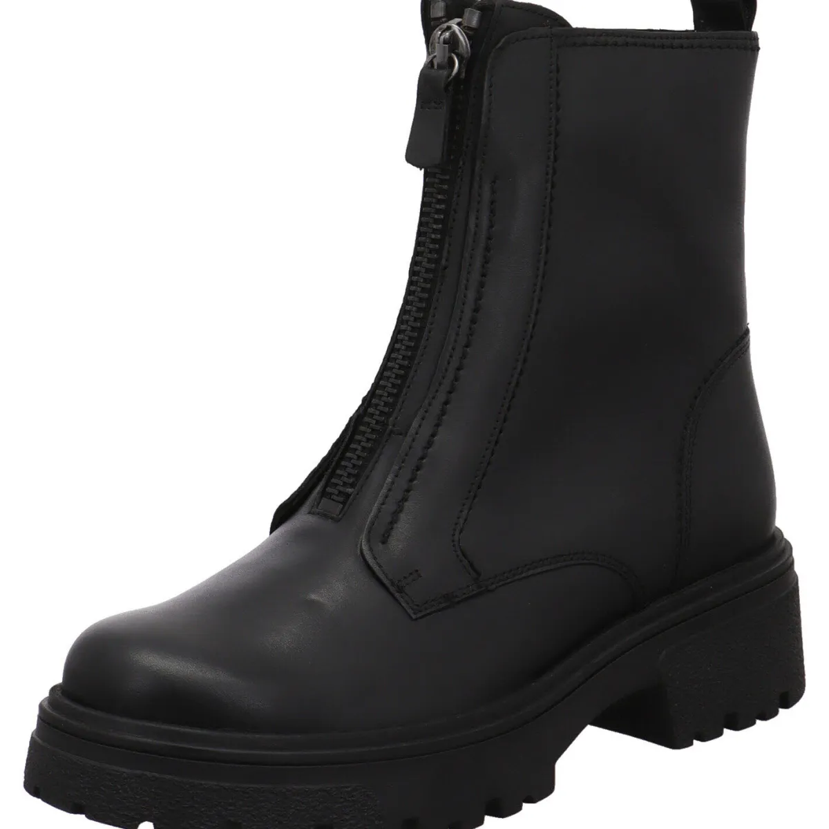 Er wurde aus Echtleder in Schwarz gefertigt. Auf dem Rist und an der Seite befindet sich je ein Reißverschluss. Dank diesen und der Lasche am Schaft ist das An- und Ausziehen gant einfach.