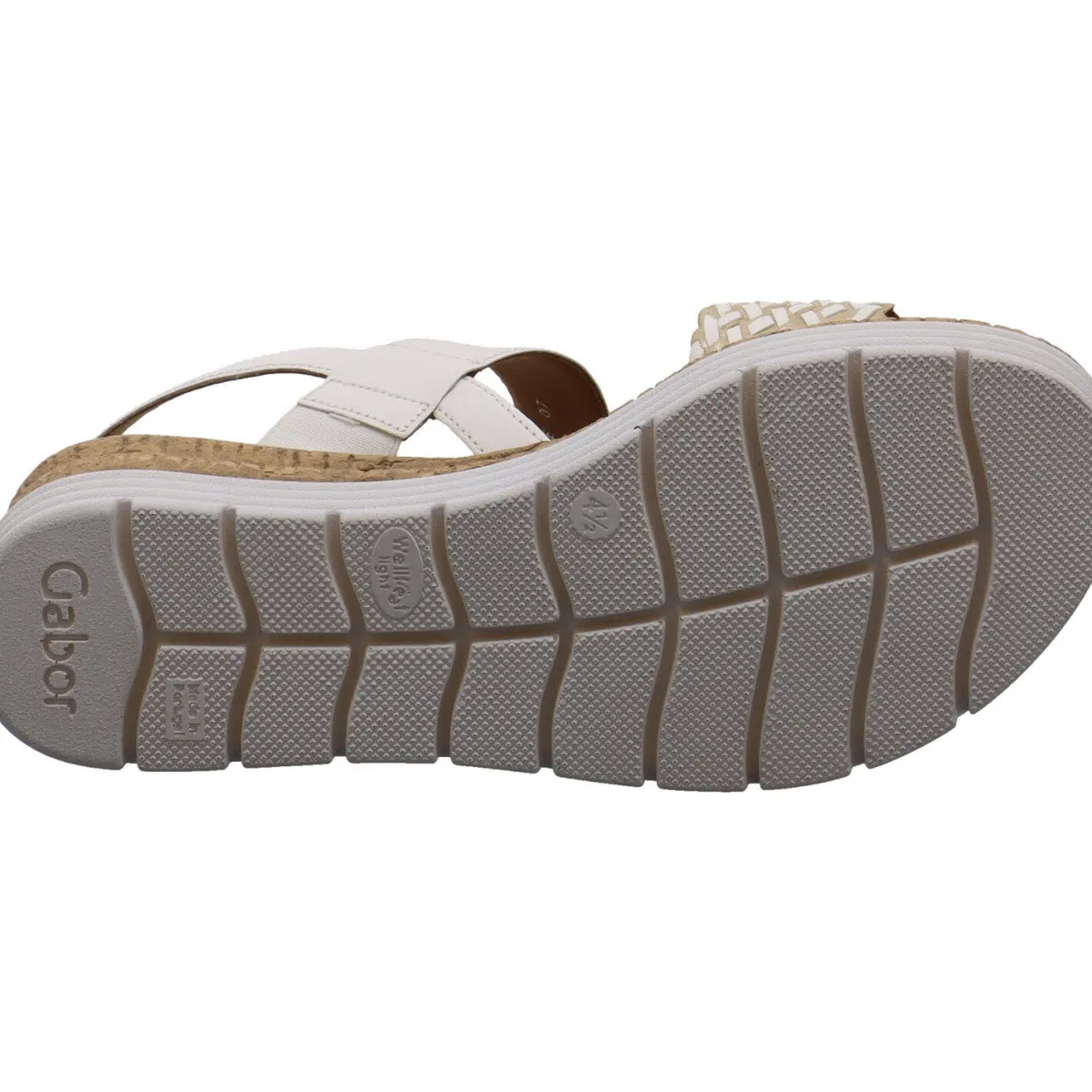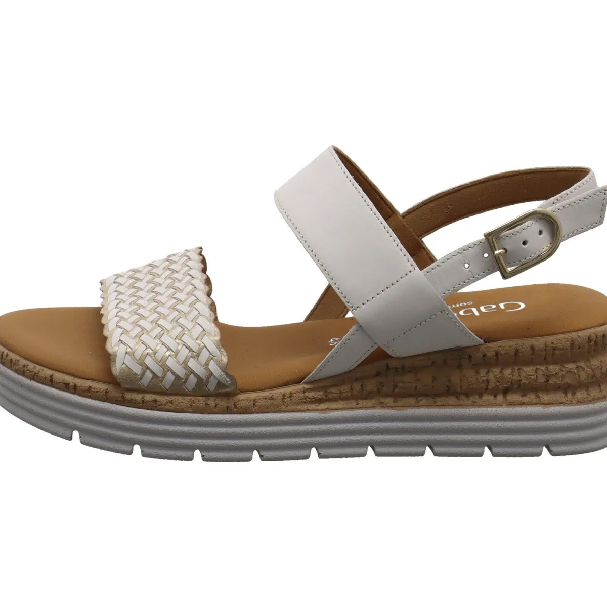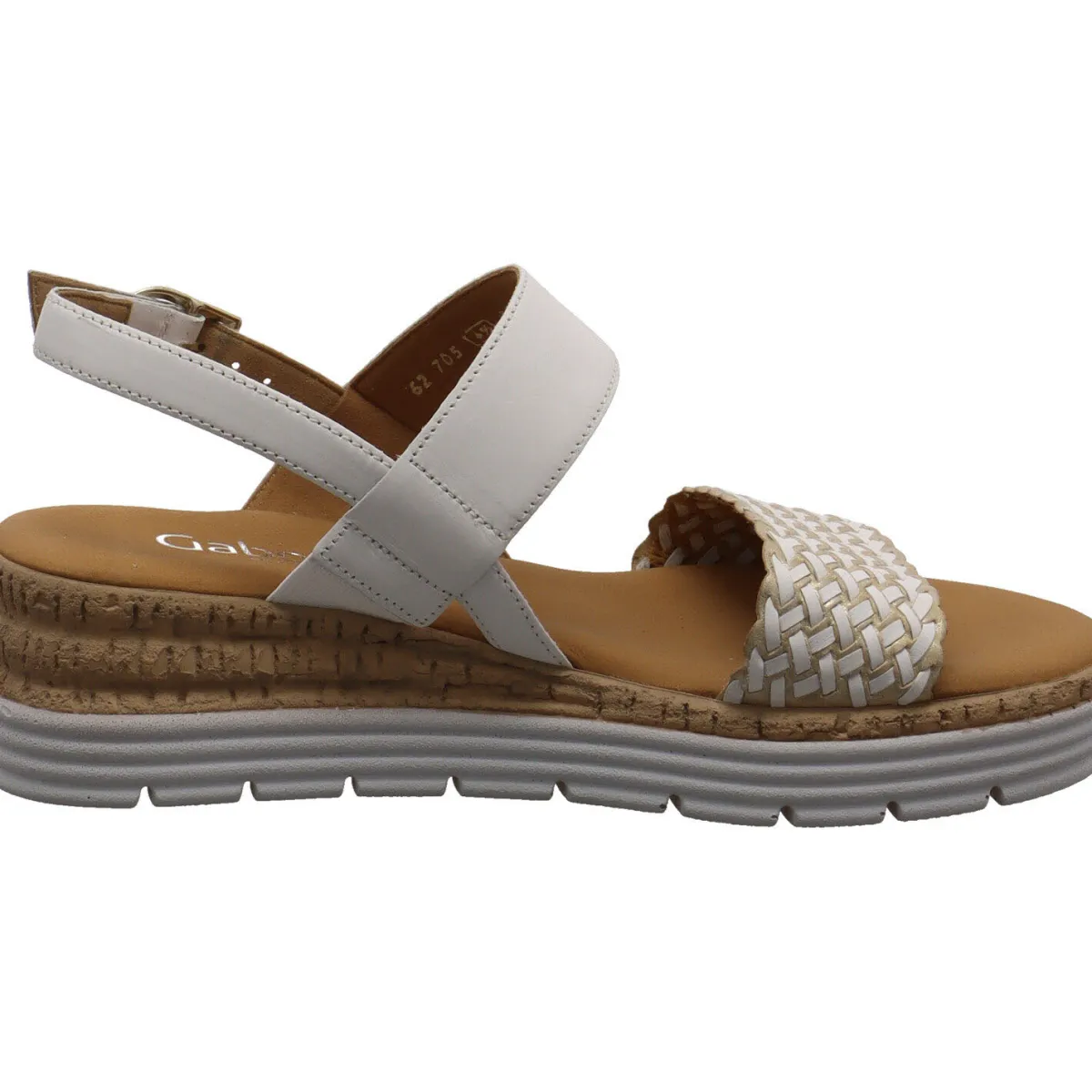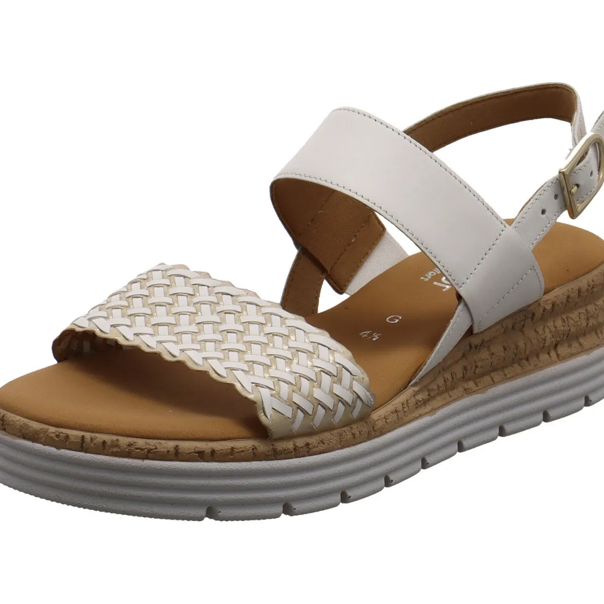 Sie wurde aus Echtleder in Weiß gefertigt. Der vordere Riemen ist hierbei mit einem schönen Web Muster in Weiß mit Gold gearbeitet. Der Fersenriemen hat einen dezenten Dehngummi und eine Schnalle zum verstellen. So kommst du ganz leicht in den Schuh und kannst ihn auf deine Bedürfnisse anpassen.