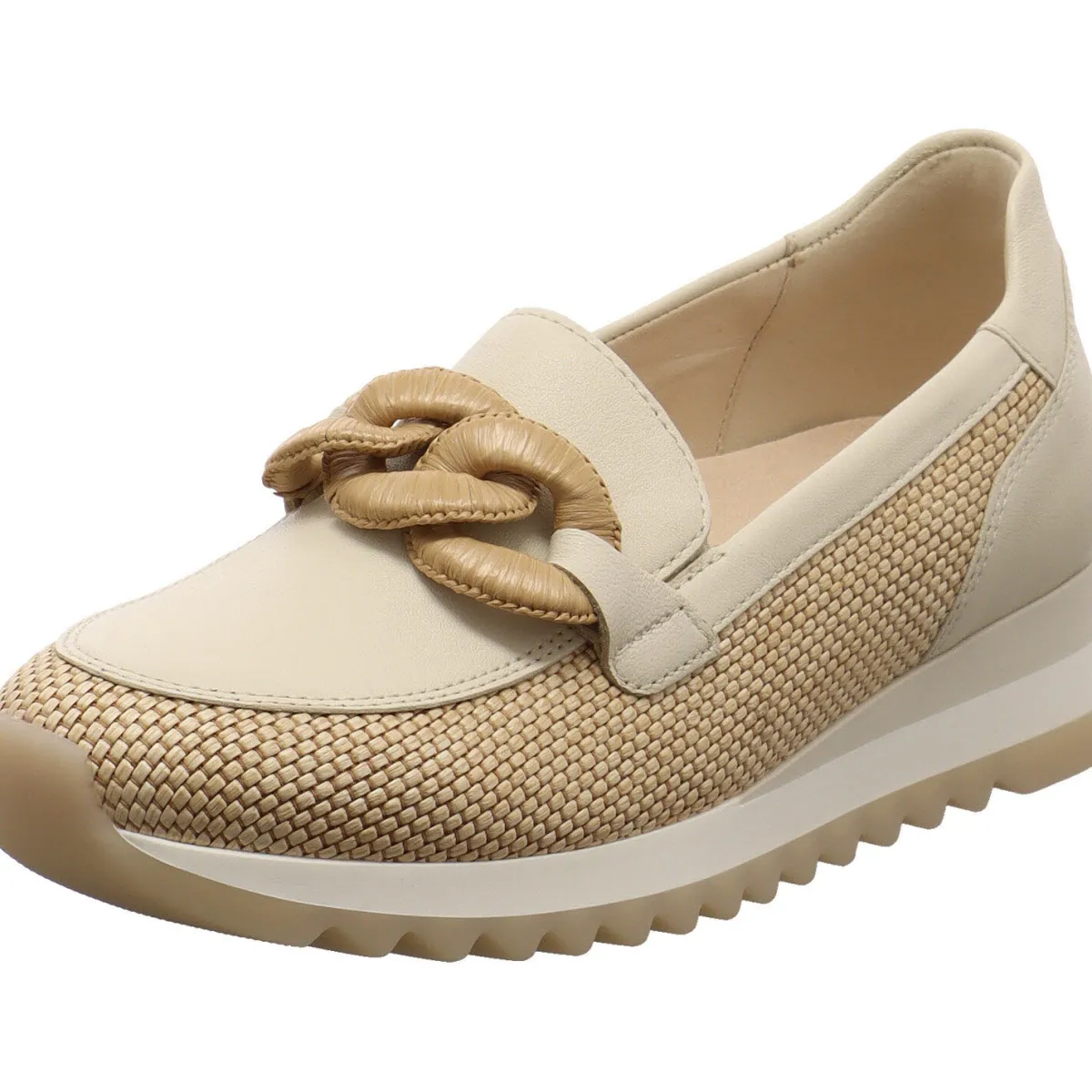 Gefertigt aus einem tollen Mix aus Echtleder und Synthetik in Beige, begeistert er uns durch die verschiedenen Haptiken. Ein Hingucker ist die Gliederkette über dem Rist. Die Rückseite vom Schaft ist höher gearbeitet und bietet einen tollen Tragekomfort.