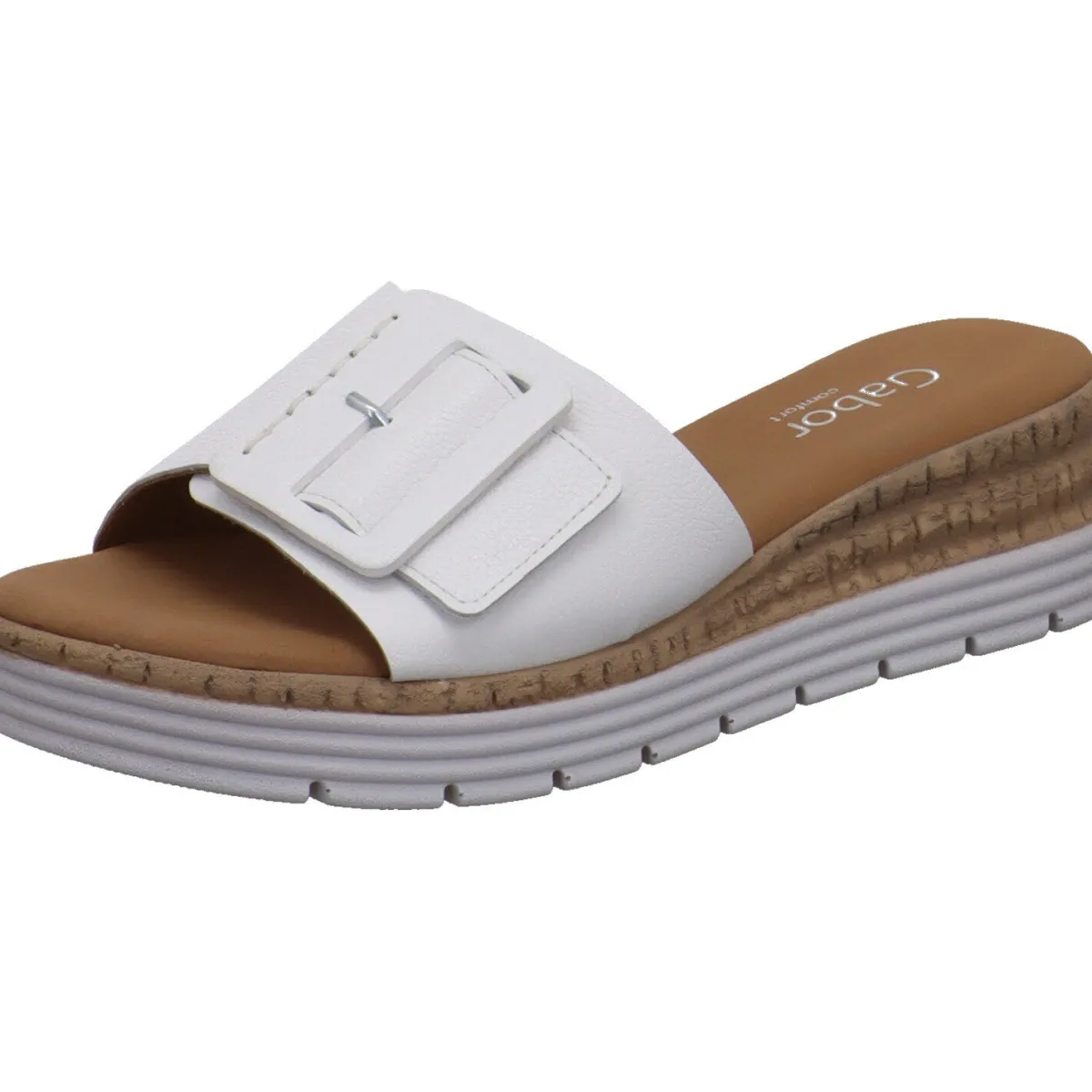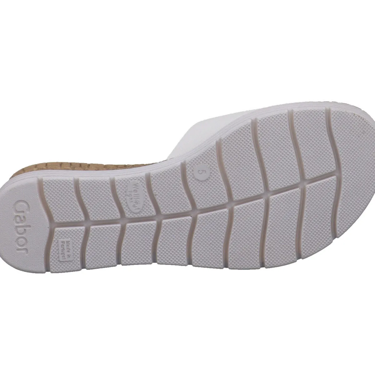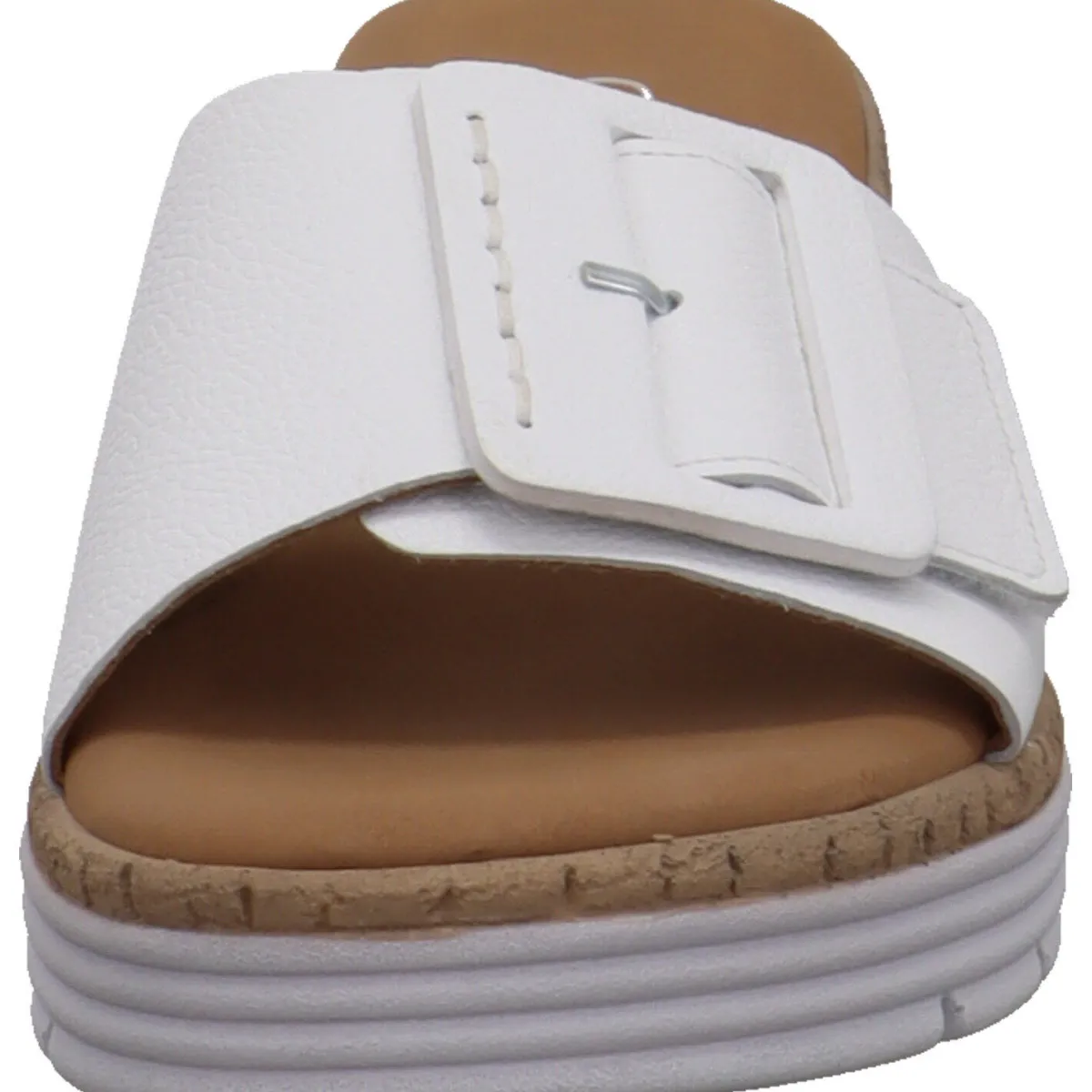 Gefertigt aus hochwertigem Glattleder in klassischem Weiß, ist der Riemen mit einem Klettverschluss und einer Zierschnalle versehen. So kannst du ihn genau auf deinen Fuß anpassen. Der schöne Keilabsatz zaubert er lange Beine. Der Eyecatcher ist dabei der Absatz mit seiner Kork Optik und der Umrandung in Weiß.