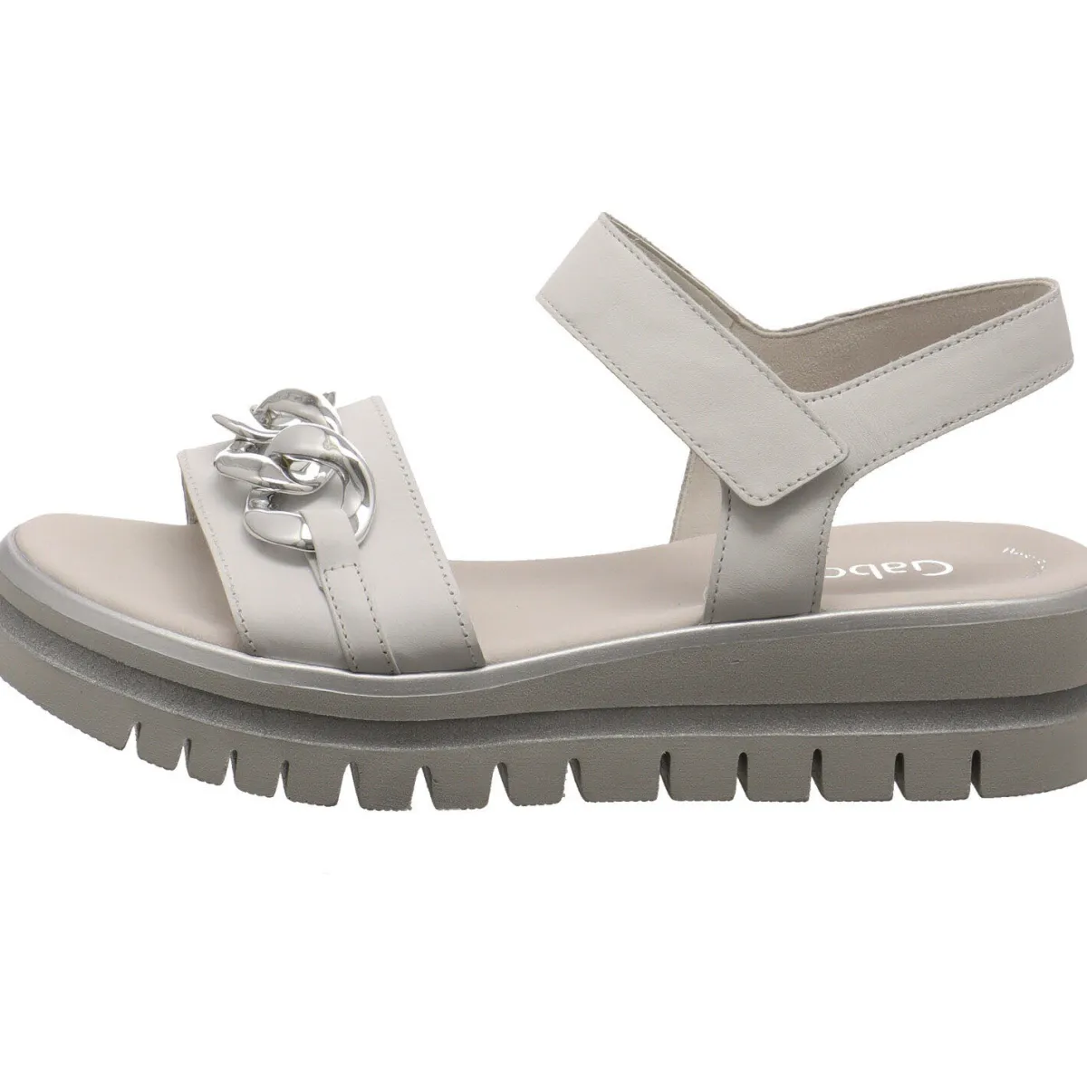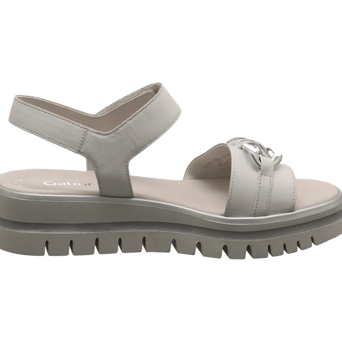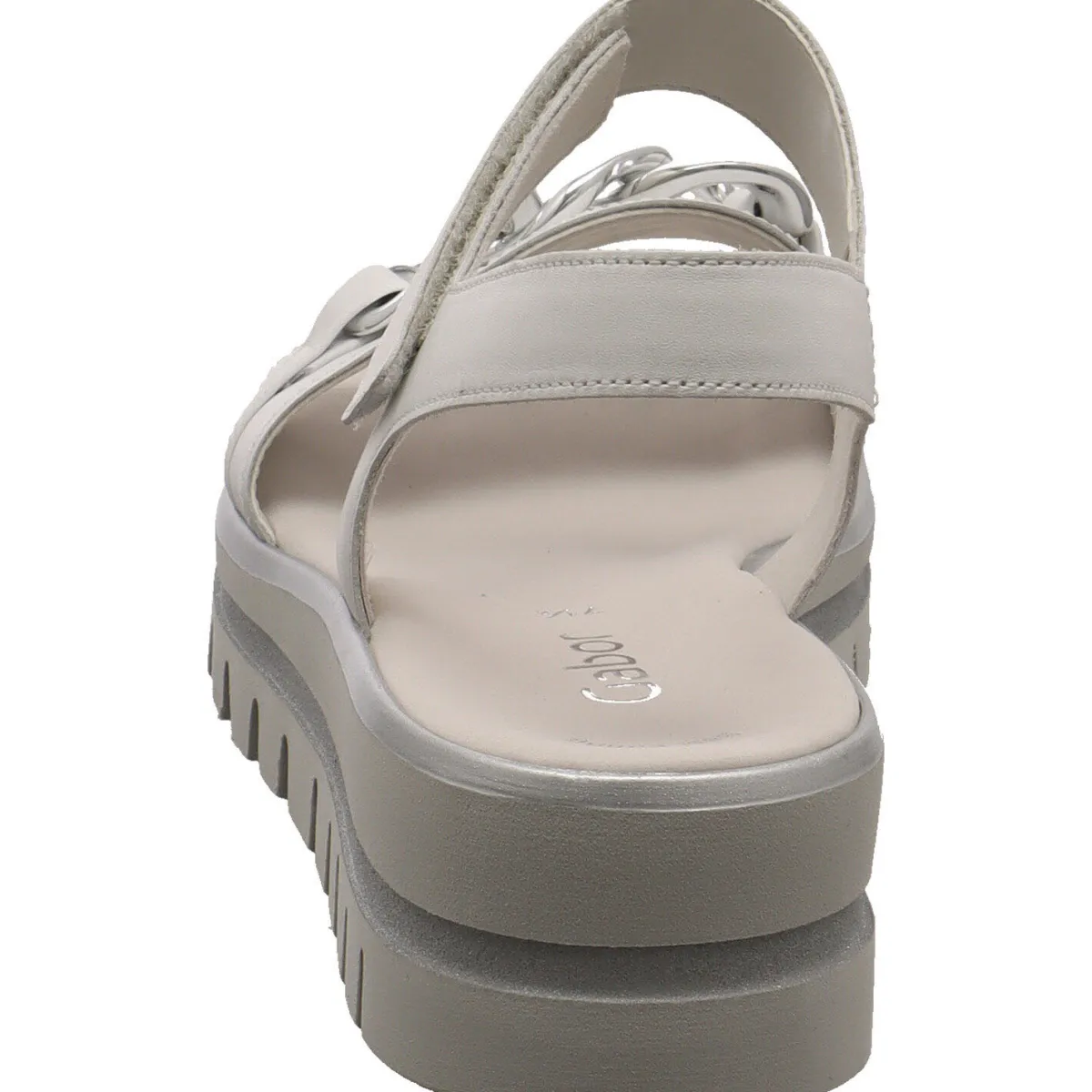 Ein besonderes Highlight ist die markante, profilierte Plateau Laufsohle, welche mit der Umrandung in Silber perfekt zum Gesamtbild des Sommerschuhs passt.