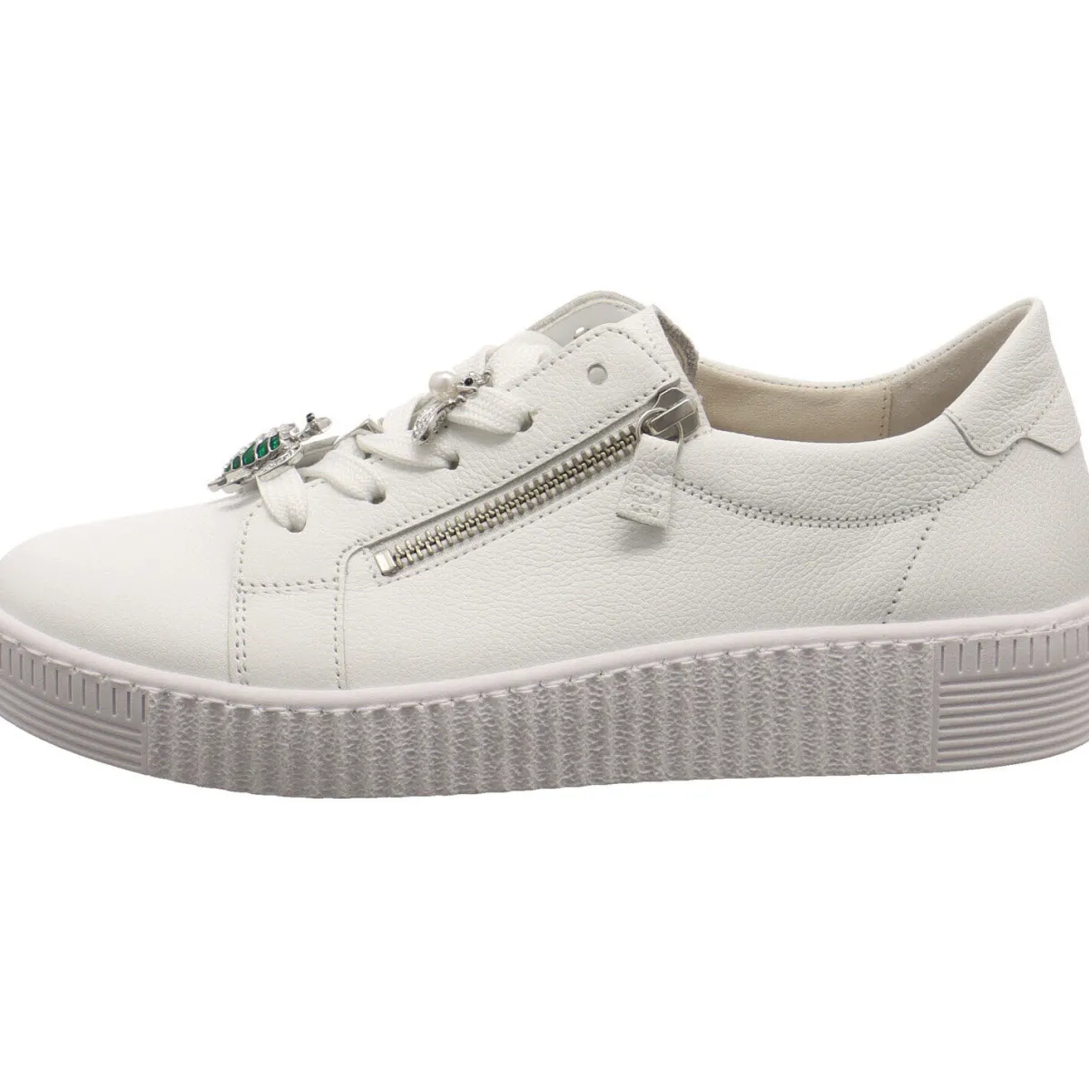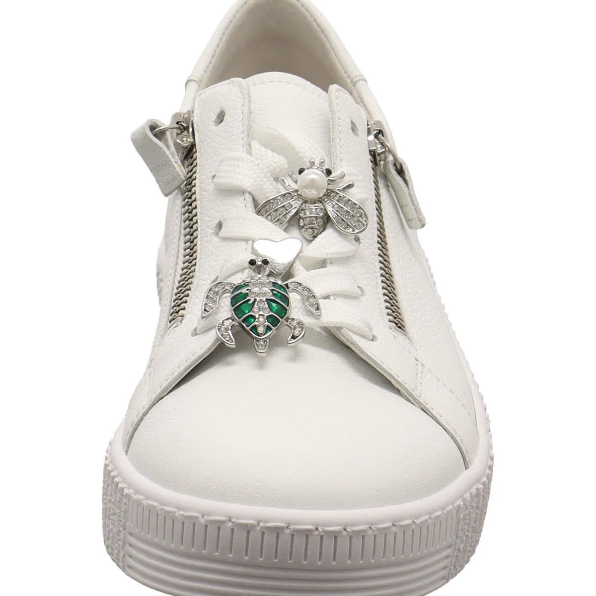 Mit dem doppelten Reißverschluss ist der Einstieg ganz einfach. Die Eyecatcher an diesem Modell sind jedoch die kleinen Metall Applikationen auf der Schnürung. So findest du eine kleine Schildkröte, ein Herz und eine Biene in Silber. Diese sind mit viel Liebe zum Detail gestaltet und machen den Schuh zu etwas Besonderem.