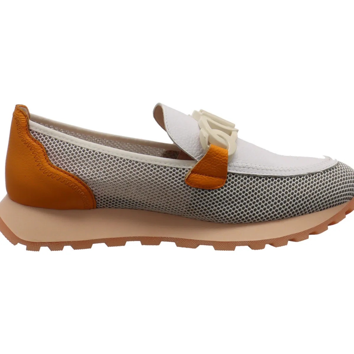 Der Schuh wurde aus einer Kombination aus hochwertigem Rindsleder in Weiß und auffälligem Orange mit atmungsaktivem Textil Mesh an der Seite gefertigt und zieht mit Sicherheit Blicke auf sich.