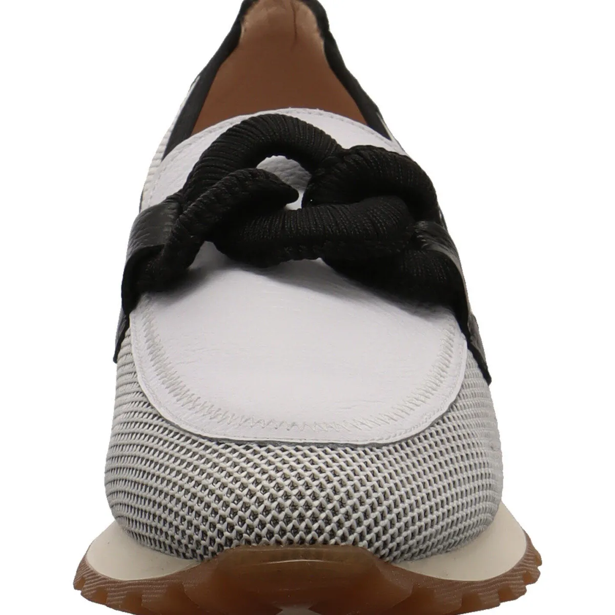 Der Schuh wurde aus einer Kombination aus hochwertigem Rindsleder in Schwarz und Weiß mit atmungsaktivem Textil Mesh an der Seite gefertigt und zieht mit Sicherheit Blicke auf sich.