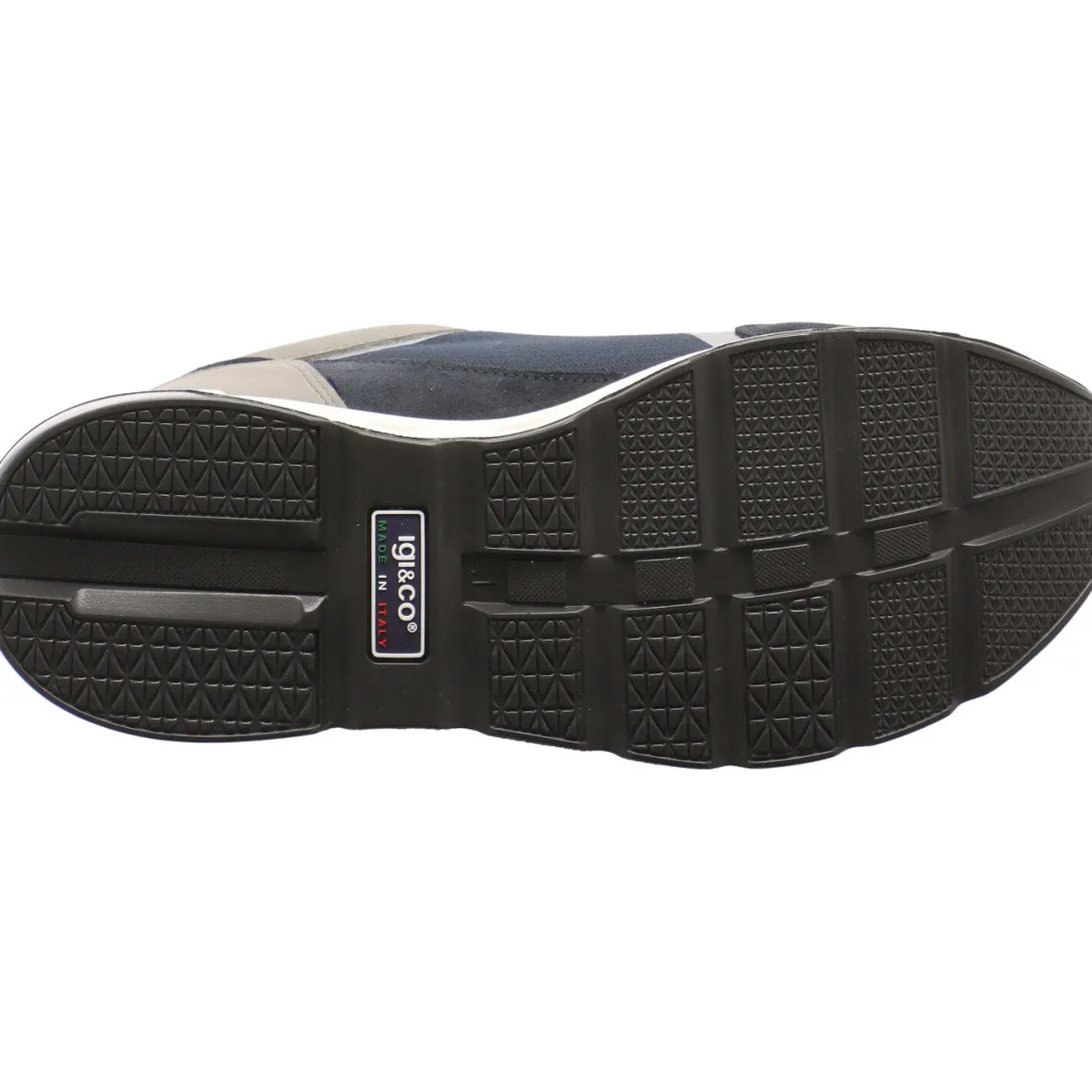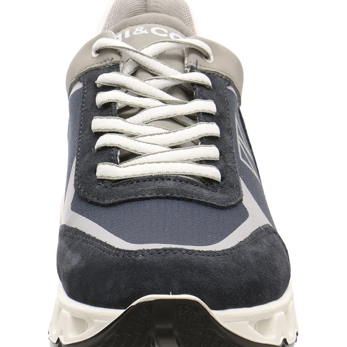 Gefertigt wurde der Sneaker für Herren in einem Materialmix aus griffigem Veloursleder in Blau und flexiblen textilen Einsätzen, die zum Teil farblich in Grau abgesetzt wurden.