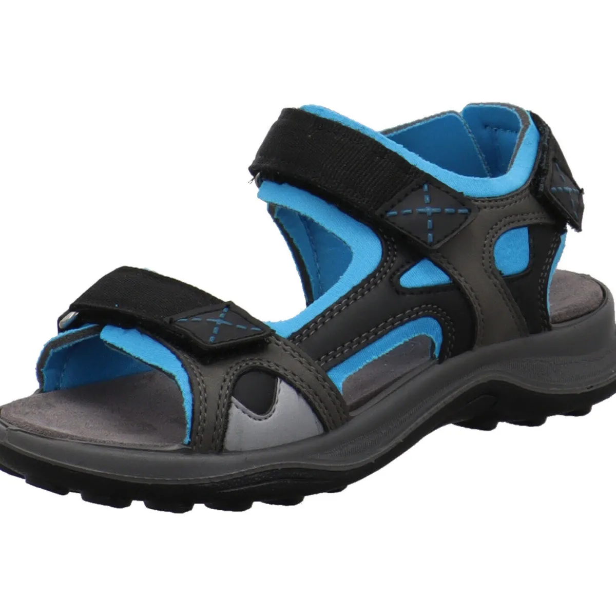 Gefertigt aus einem Mix aus Kunstleder in Schwarz und Textil in Blau bietet er ein angenehmes Tragegefühl. Durch den dreifachen Klettverschluss lässt der Schuh im Trekking Look sich optimal dem Fuß anpassen.