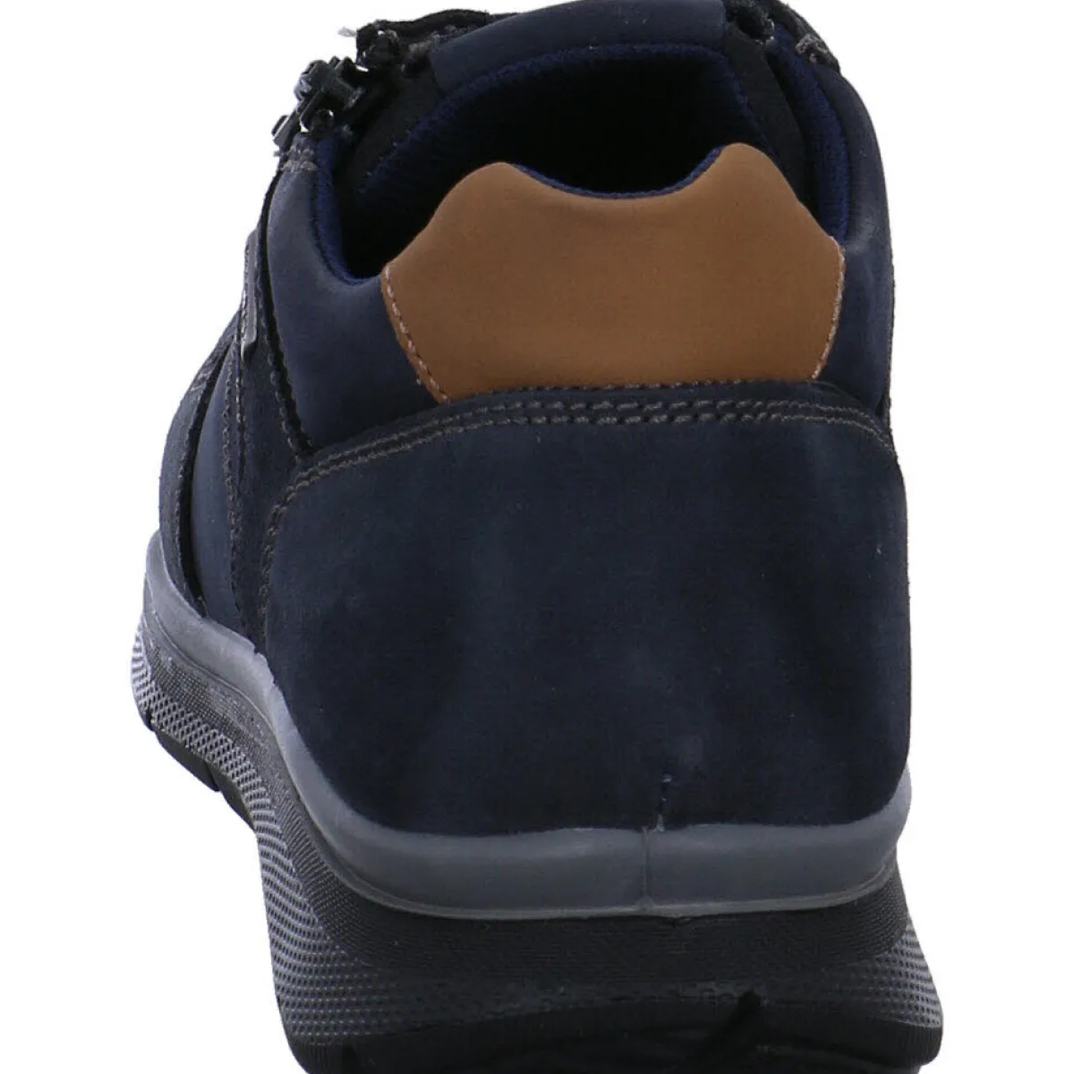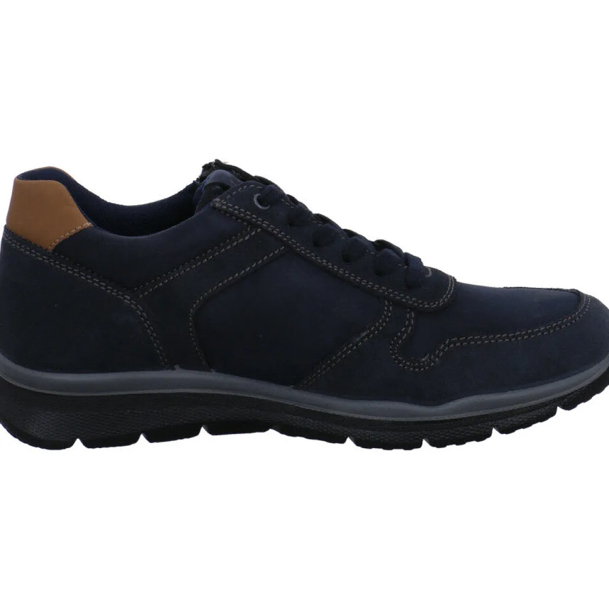 Gefertigt aus hochwertigem Nubukleder in Blau ist er mit einer modischen Overlay Struktur versehen, welche durch helle Ziernähte und Farbakzente in Braun gekonnt in Szene gesetzt wird.