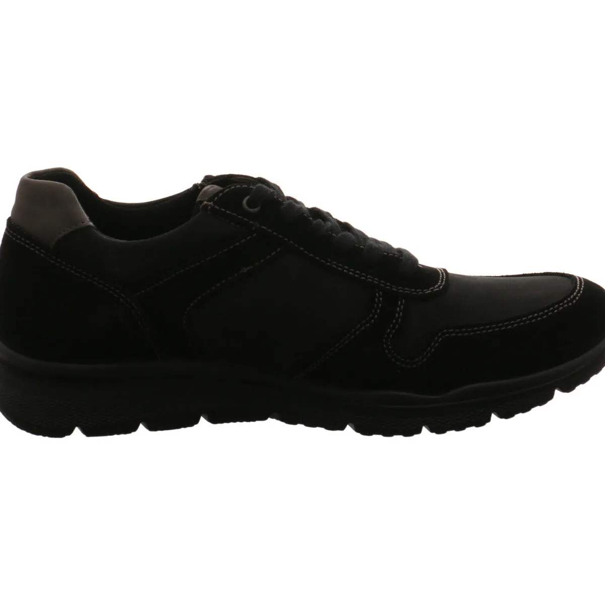 Gefertigt aus hochwertigem Nubukleder in Schwarz ist er mit einer modischen Overlay Struktur versehen, welche durch helle Ziernähte und Farbakzente in Grau gekonnt in Szene gesetzt wird.