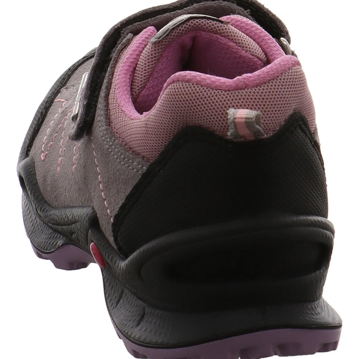 Das Obermaterial aus einem Mix aus Nubukleder und Kunstleder in Grau ist mit Akzenten in Rosa und Lila verziert.