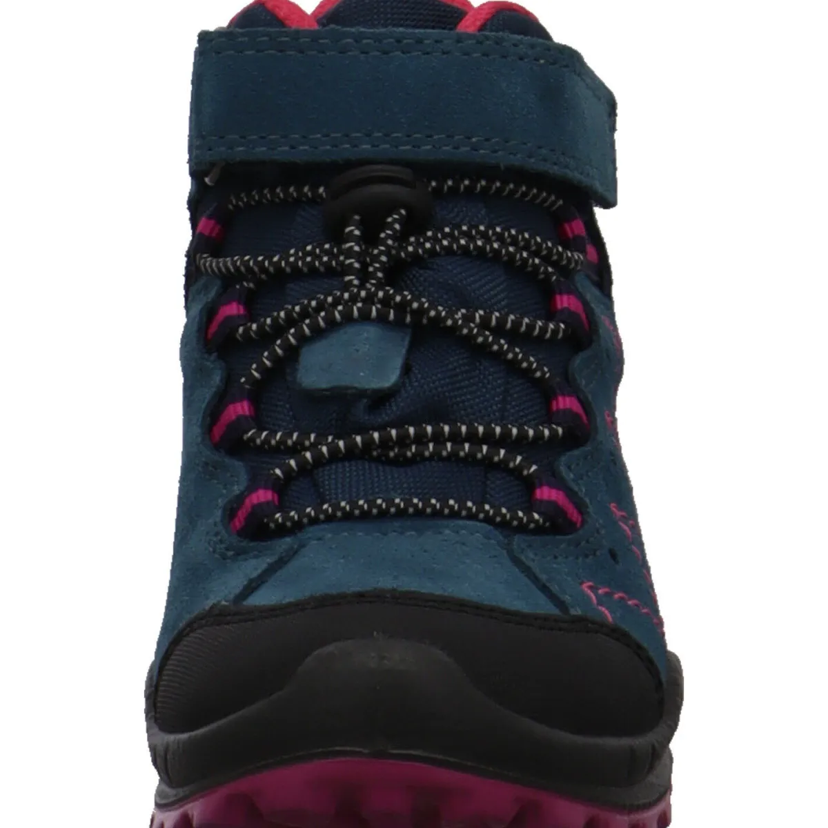 Der Schuh begeistert durch seinen Mix aus Veloursleder und Synthetik in Blau mit farblichen Akzenten in Pink und Schwarz.