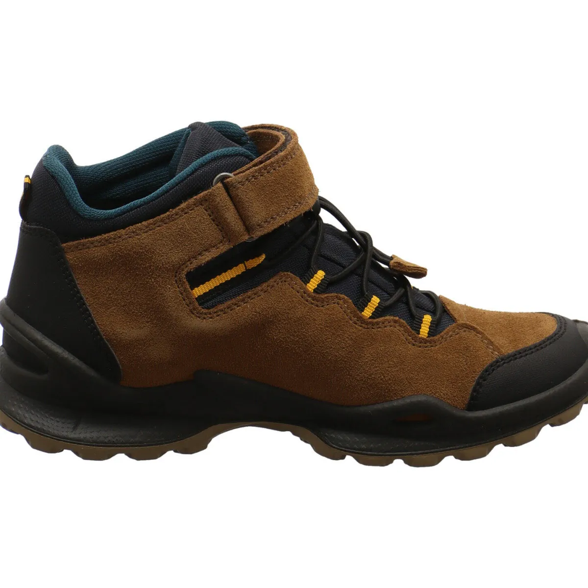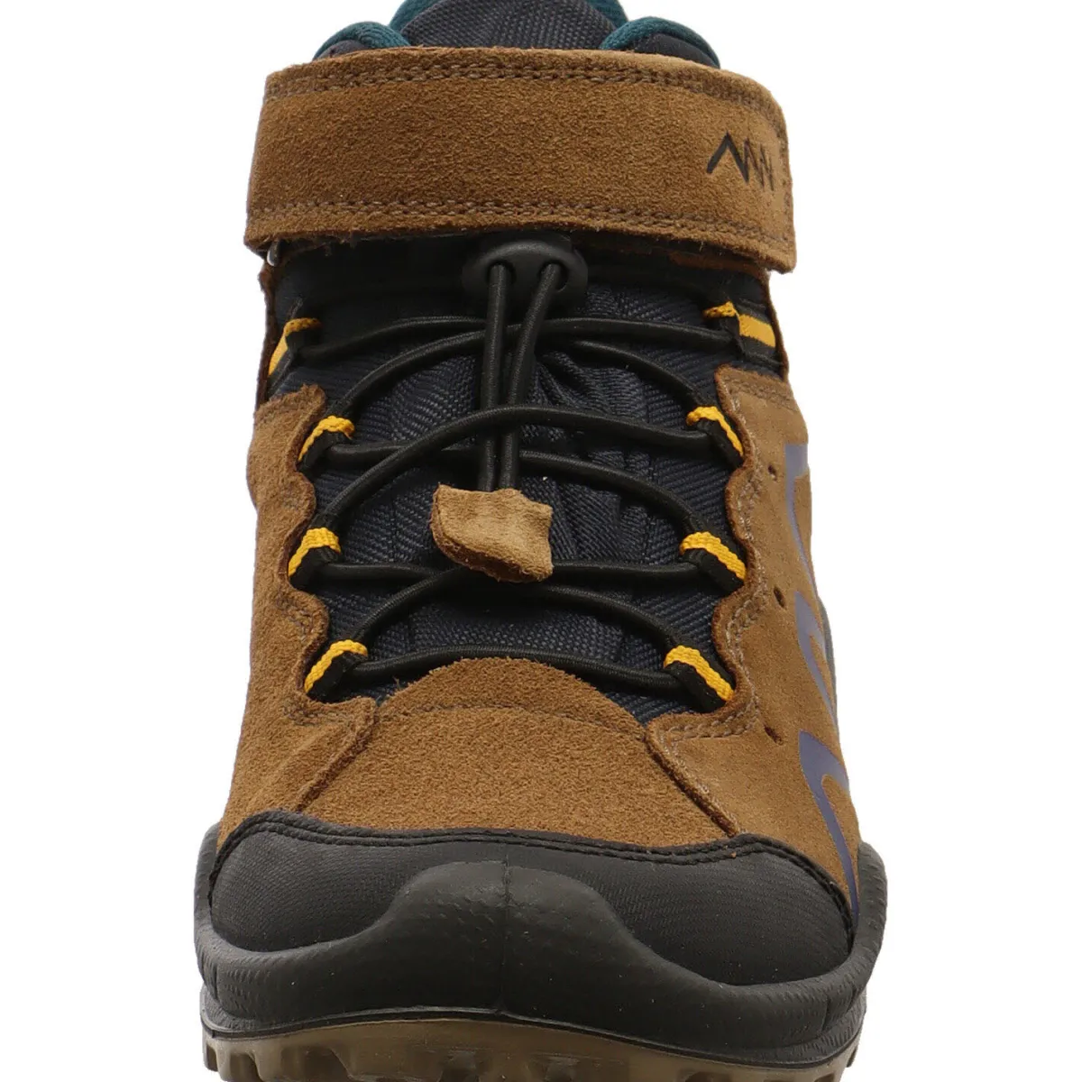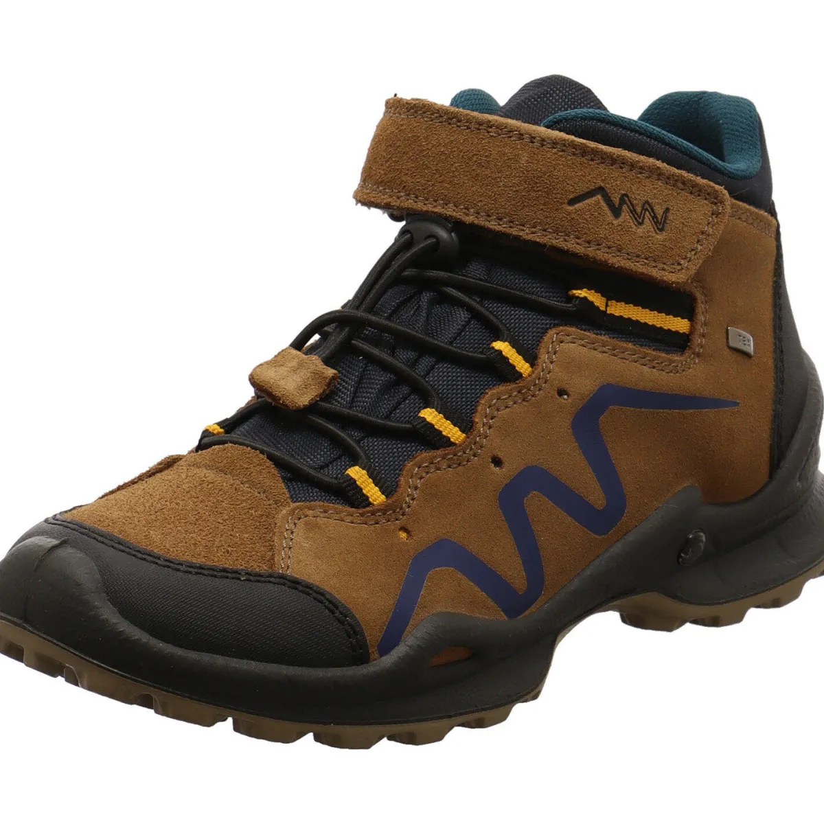 Der Schuh begeistert durch seinen Mix aus Veloursleder und Synthetik in Braun mit farblichen Akzenten in Blau.
