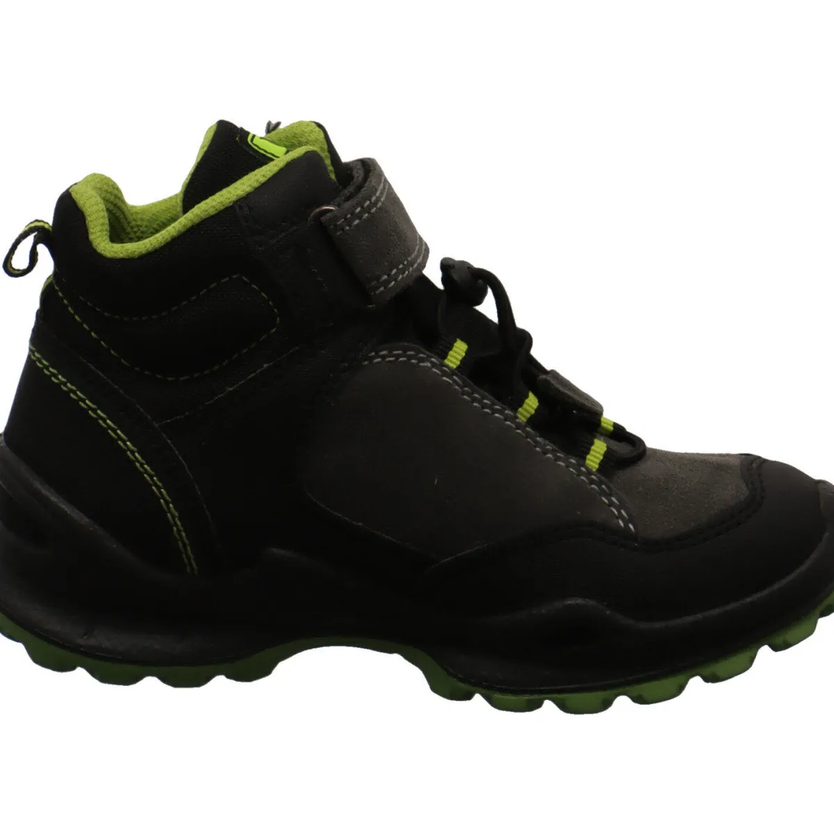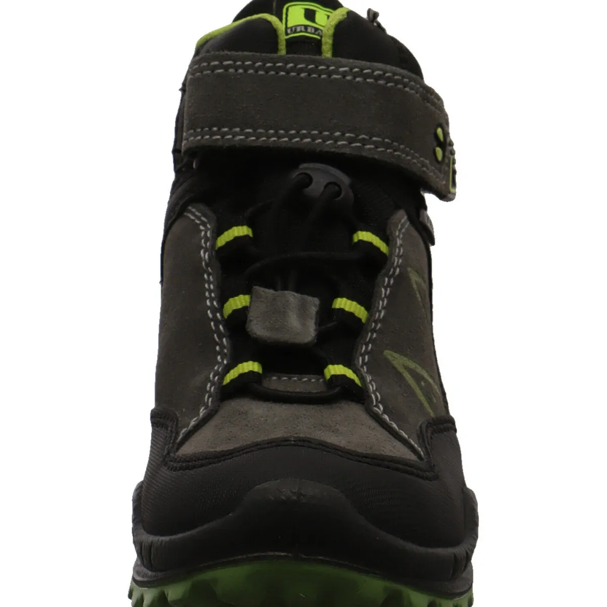 Der Schuh begeistert durch seinen Mix aus Veloursleder und Kunstleder in Grau mit farblichen Akzenten in Grün und Schwarz.