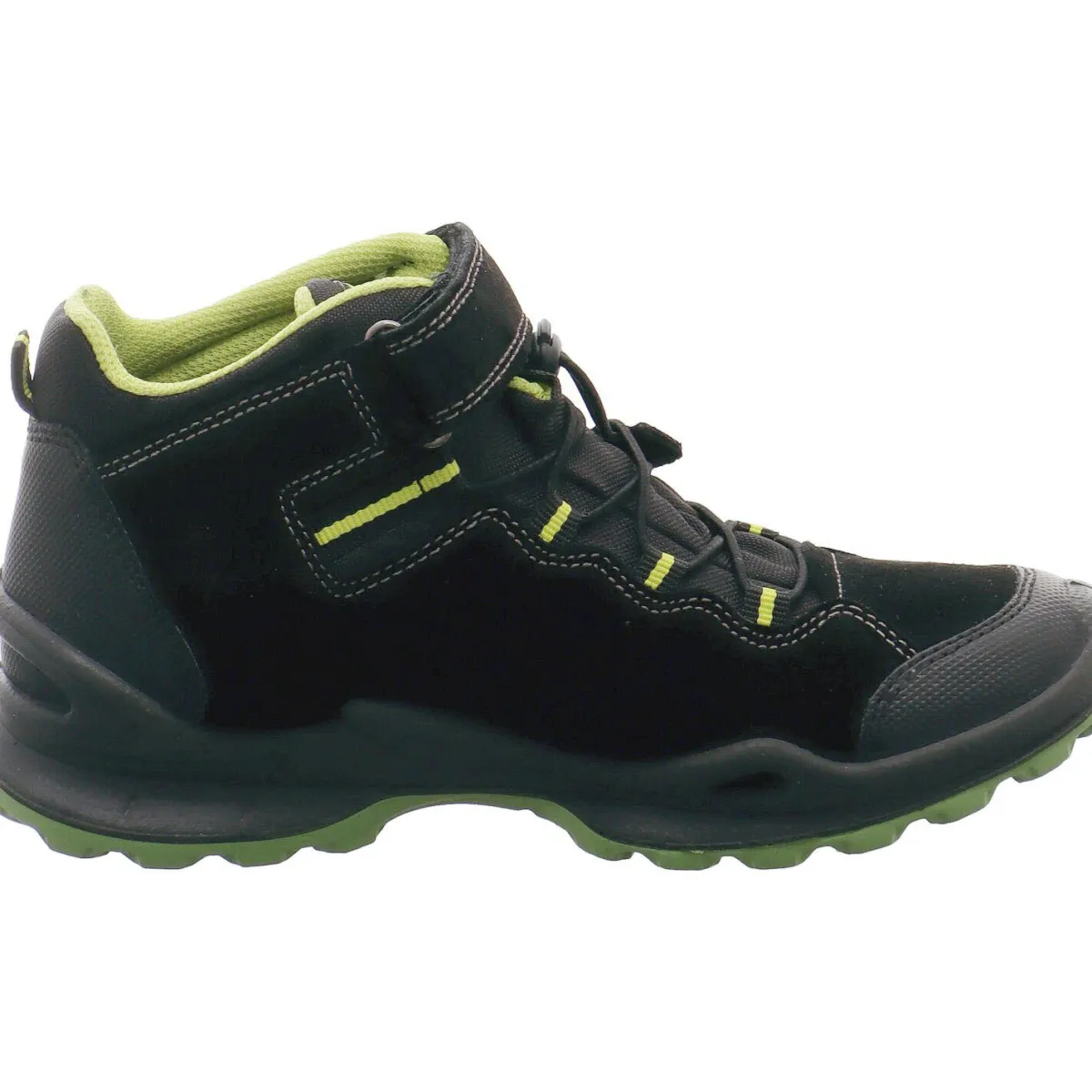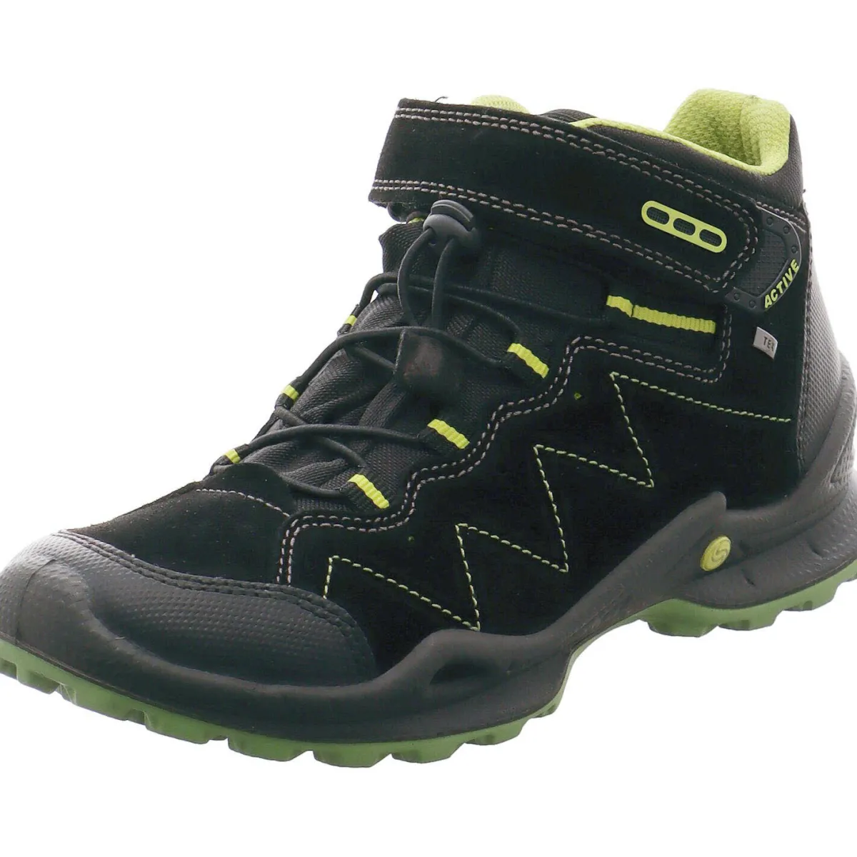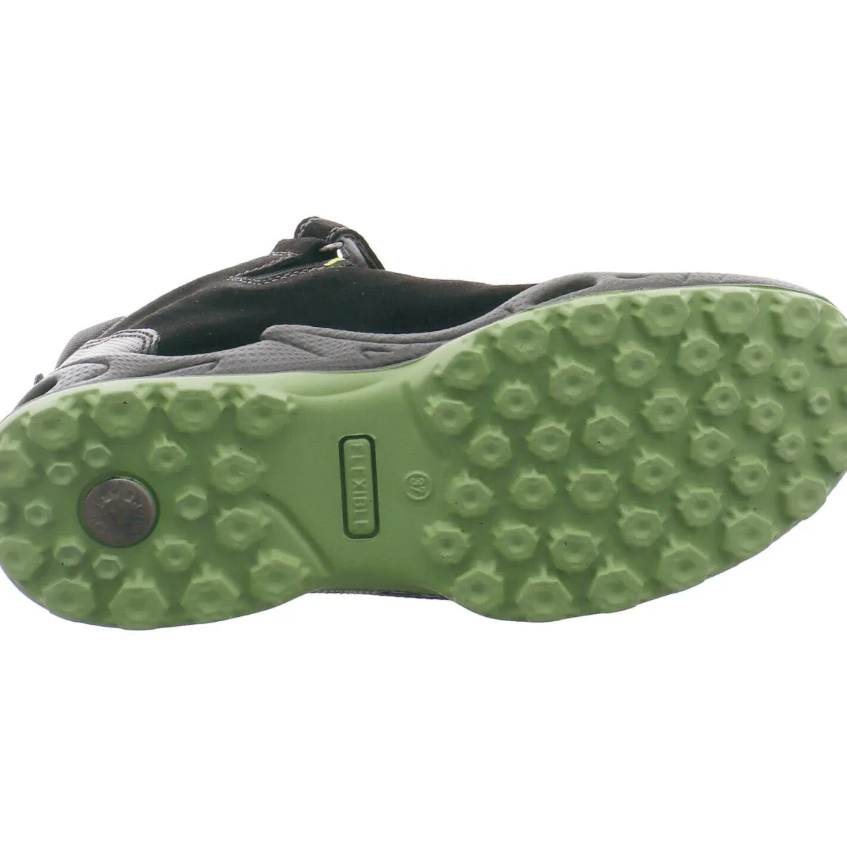 Der Schuh begeistert durch seinen Mix aus Veloursleder und Kunstleder in Schwarz mit farblichen Akzenten in Neon Grün.