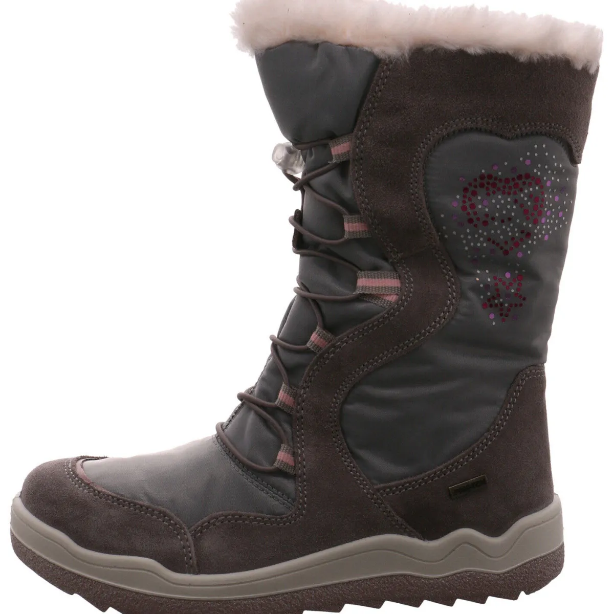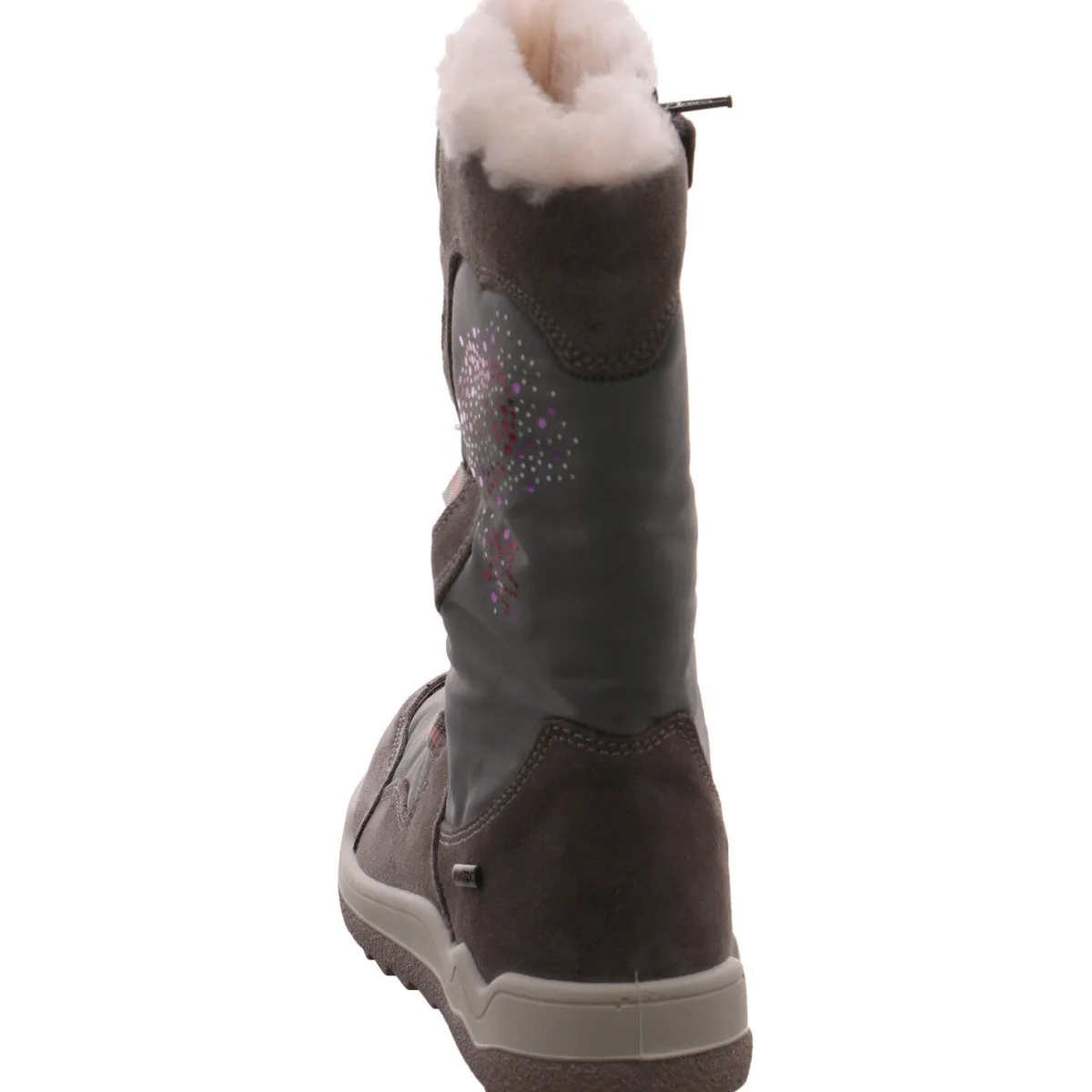 Gefertigt aus einem Mix aus hochwertigem Veloursleder in Grau mit Textil Einsätzen ist er mit einem Herz und Stern im Glitzer Look am Schaft verziert. Die Schuhspitze und Ferse sind verstärkt und dadurch besonders robust.