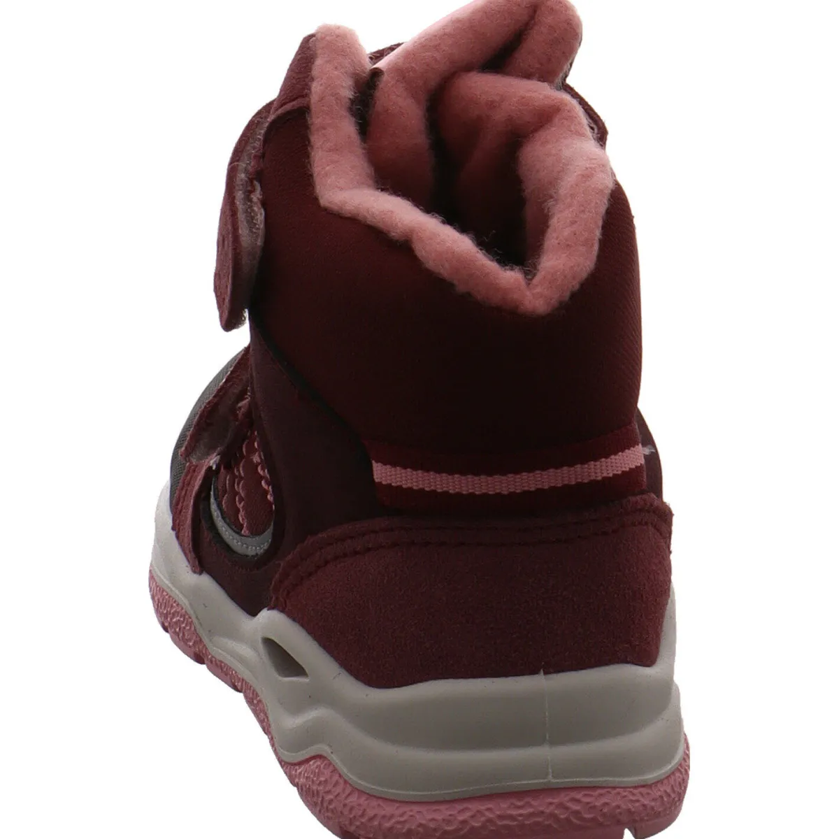 Das Obermaterial aus einem Mix aus Echtleder und Textil in Weinrot gefertigt.