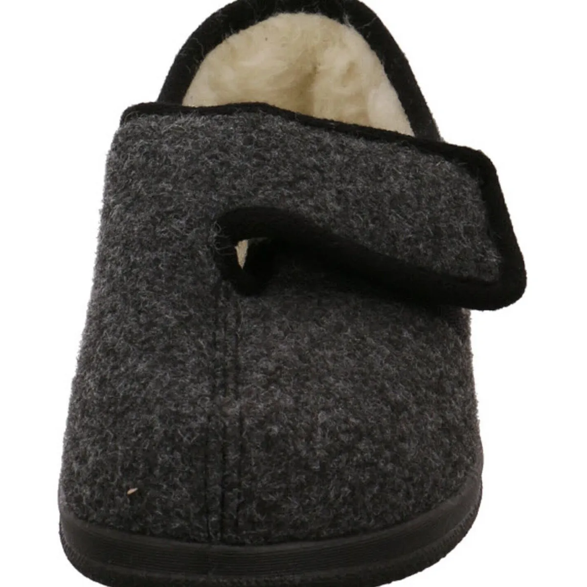 Der Hausschuh ist mit einem mollig warmen Innenfutter aus echter Schurwolle ausgestattet und der Klettverschluss sorgt für eine perfekte Passform und einen leichten Einstieg.